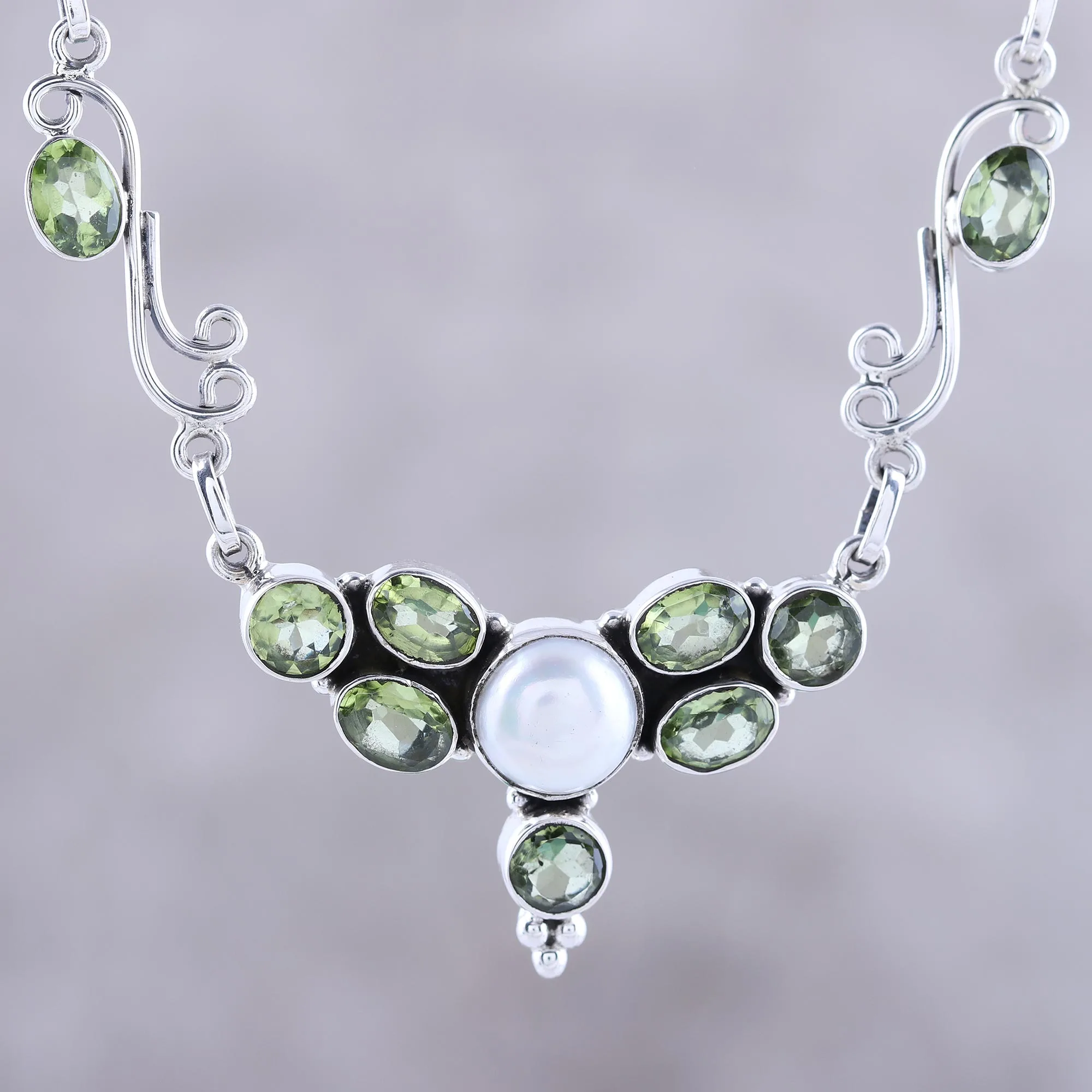 Featuring clusters of faceted peridot gemstones that surround a single cultured pearl, this pendant necklace from India captures the effortless beauty of nature. The necklace is presented by Neeru Goel, with handcrafted sterling silver motifs surrounding the stones.