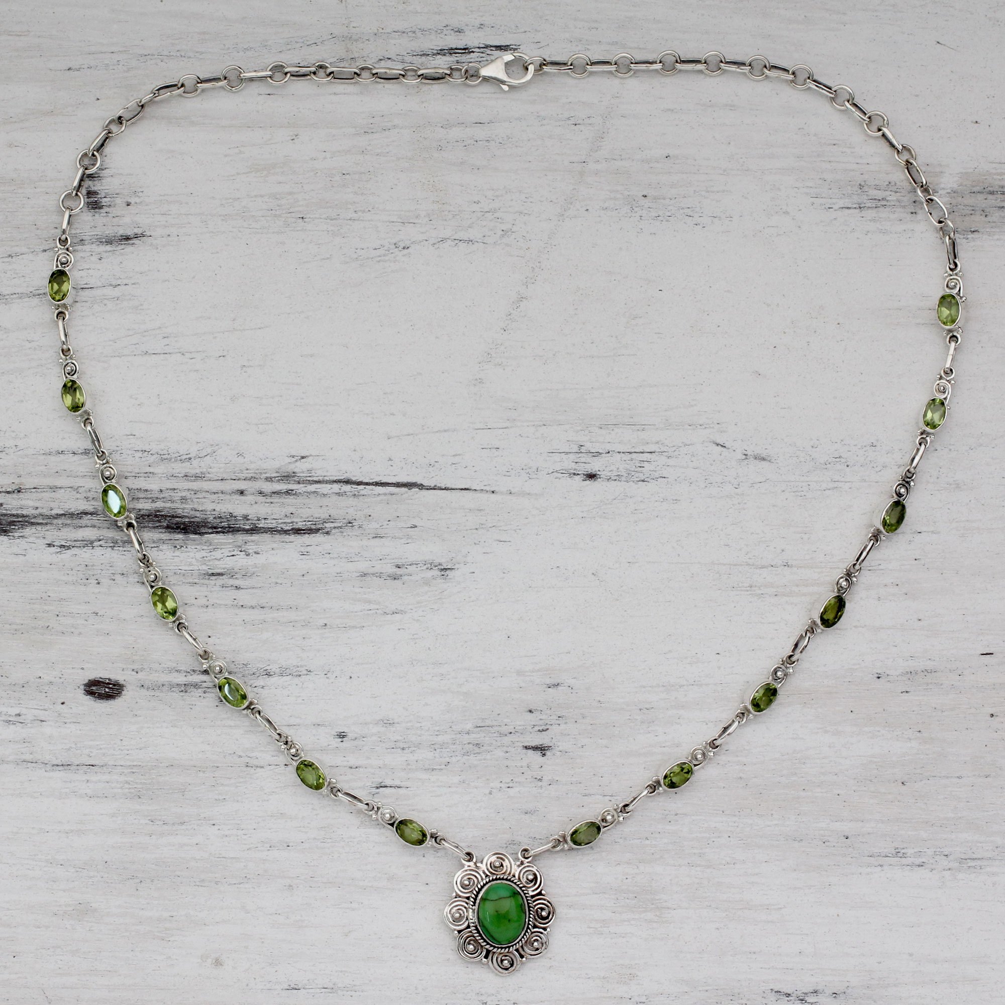 Sterling silver petals surround an oval gemstone to center this dazzling necklace. From Neeru Goel in India, it showcases peridot gems totaling 14 carats on the chain. Composite turquoise complements with its deep green tonalities with flecks of gold.