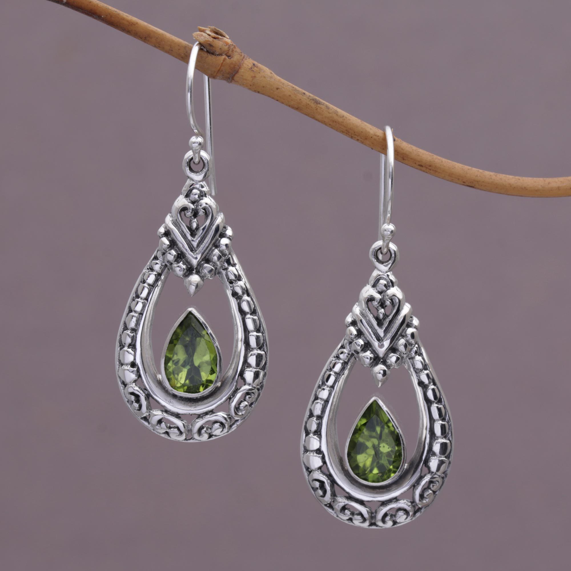 Exquisite swirl and dot motifs decorate each of these drop-shaped dangle earrings. Crafted by Indonesian artisan Nyoman Rena, the earrings gleam with the glistening beauty of peridots.