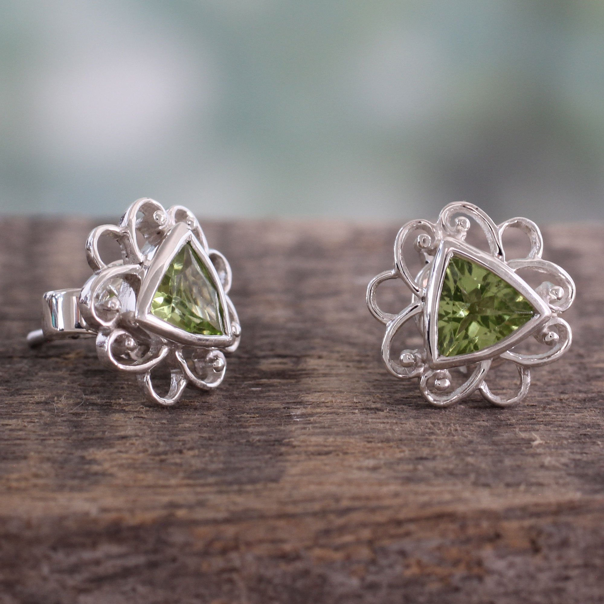 The sparking allure of peridot evokes verdant light. Framed in silver, the faceted gemstones total 1.5 carats as Shubhra Singh designs these beautiful sterling silver earrings.