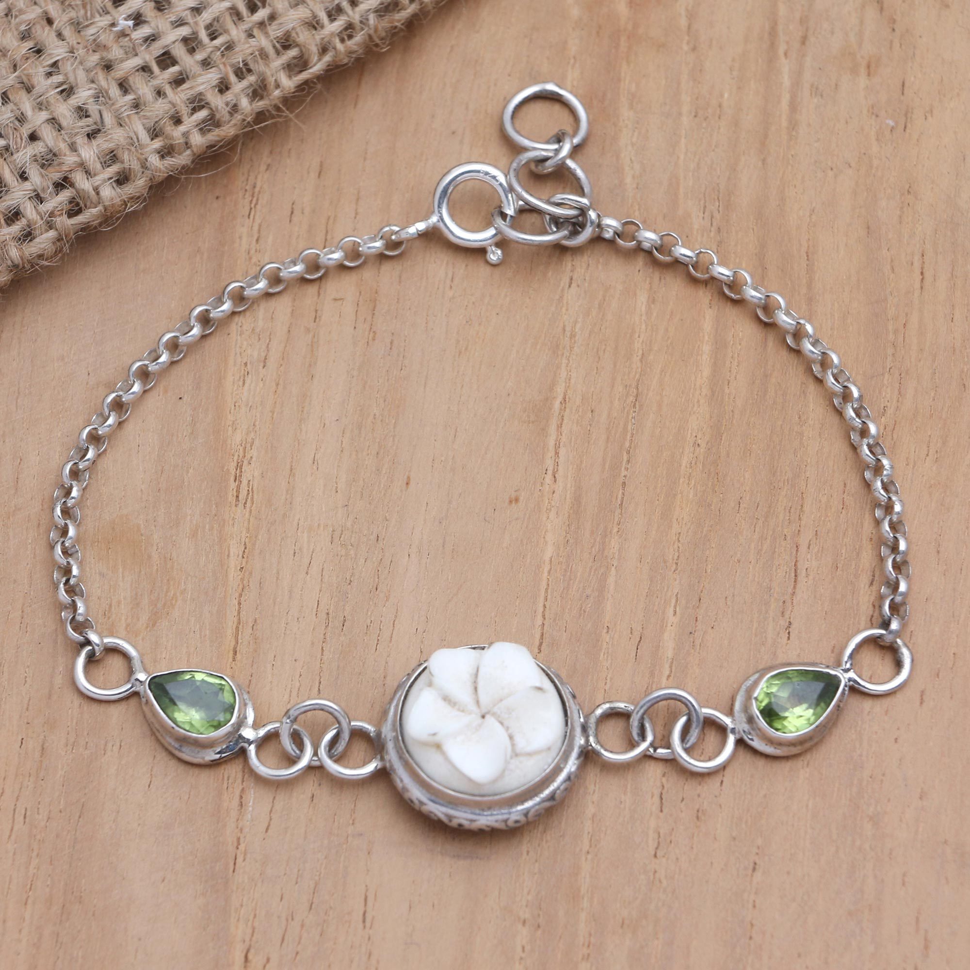 Welcome spring with the fresh green gems and floral motif on Ayu Ary's charming pendant bracelet. The Balinese artisan centers the bracelet with a pale flower, hand carved from natural bone, then embellishes her creation with two faceted peridot gems in bezel settings. A sterling silver rolo chain and spring ring clasp add shining details.