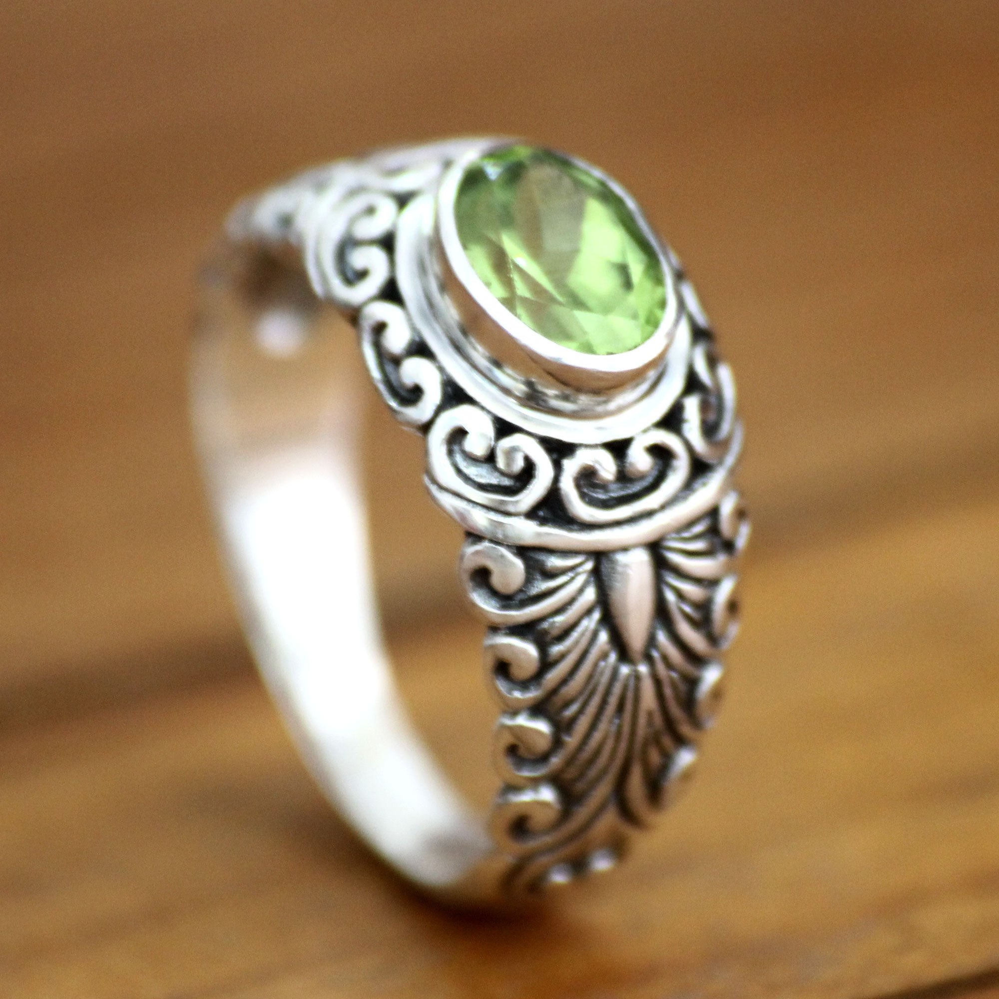 Replete with Balinese styling, this ring by Kenari is admirable. The Augsut birthstone, peridot, crowns the florid design of the ring, which is crafted of sterling silver featuring oxidized contrasts.