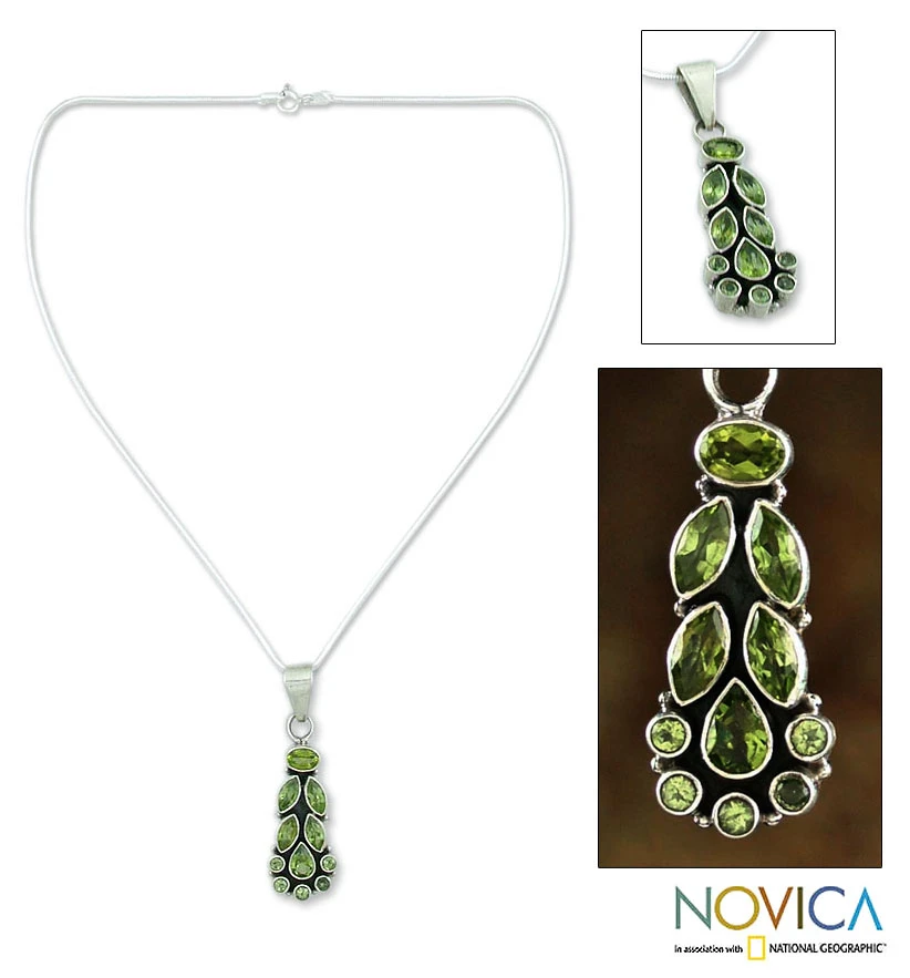 This pendant is shimmering with the brightness of spring. Made by Neeru Goel from India, this necklace is handcrafted from sterling silver (.925) and beautiful peridot gemstones. With a design that melds the artist's style with a fresh green hue, this necklace is both elegant and bright, and perfectly complements both sun dresses and evening wear.