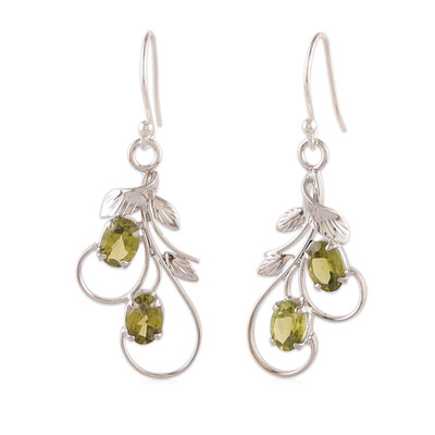 Peridot Silver Dangle Earrings with Leaf and Tendril Design, 'Verdant Leaves'