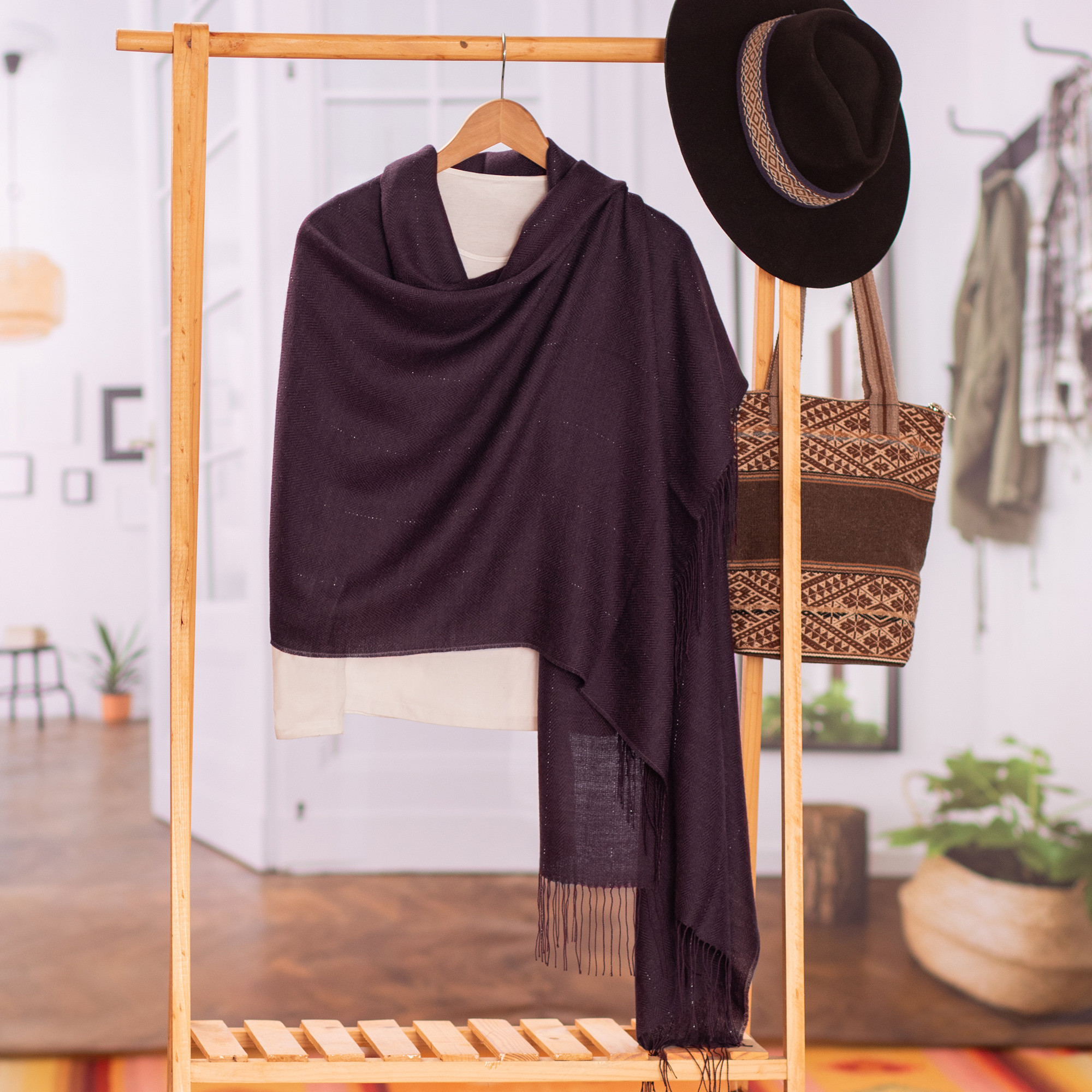 Woven by hand, this scintillating shawl features delicate strands of silver that bring sparkle to the design. Raquel and Gregor work on a traditional loom to weave the wrap by hand. A blend of luxurious baby alpaca, soft pima cotton and nylon accents form a subtle herringbone motif along the length of the deep purple shawl.