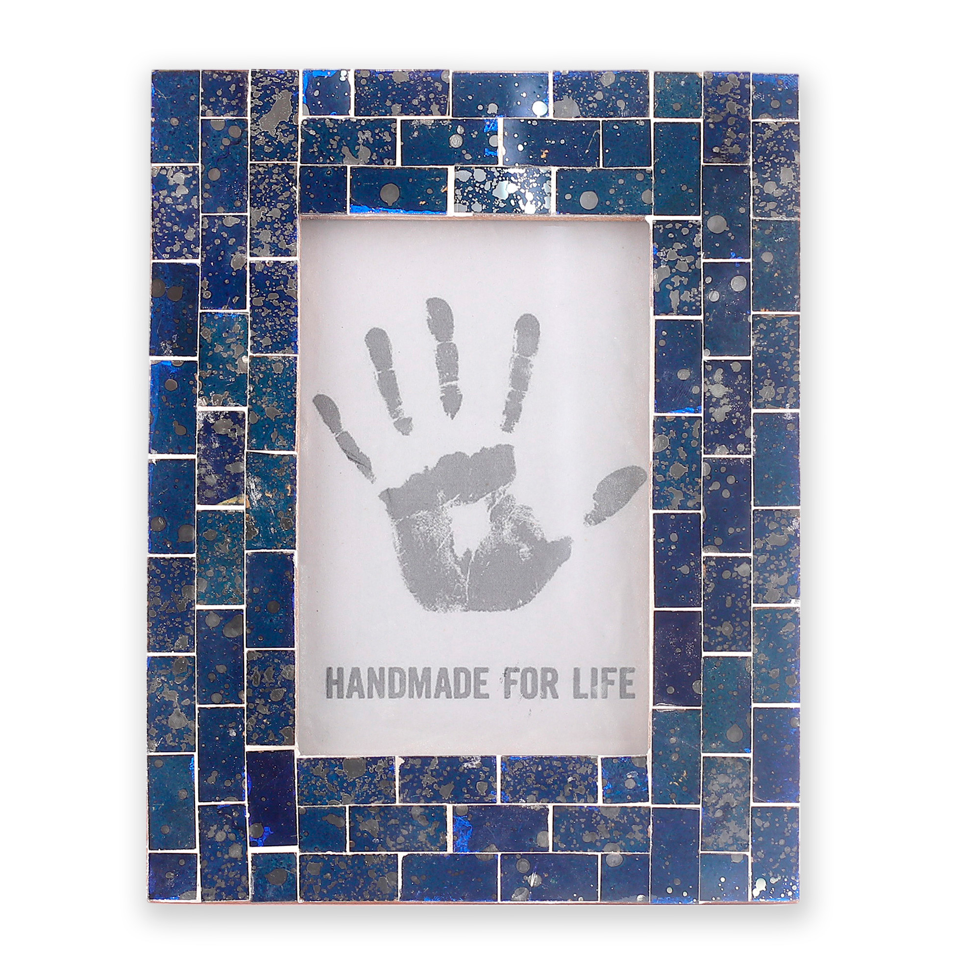 Return to those harmonious days with a series of mosaics of cool colors—as enchanting as those moments you capture in a photo. Kamal's artisan team uses glass pieces on a wood structure to create this photo frame, embraced by little tiles in a midnight hue.