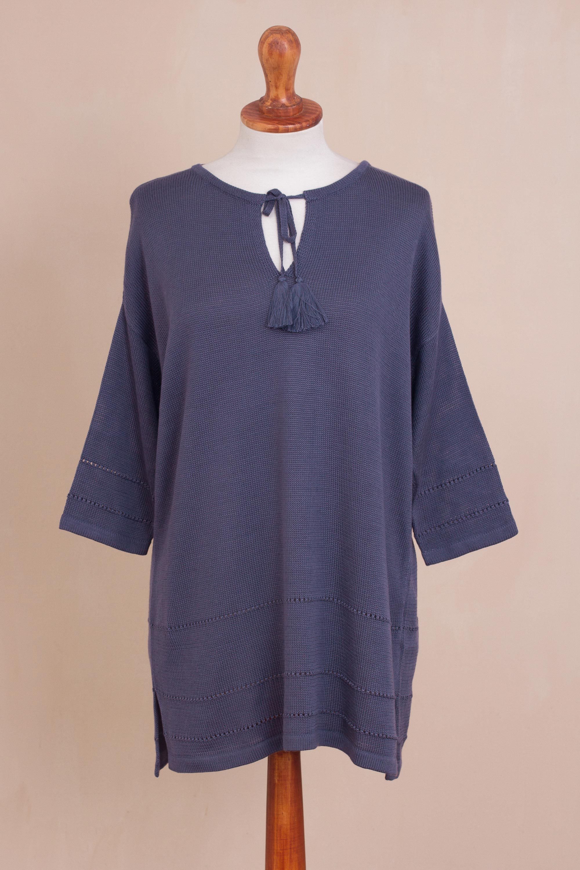 In a flirty blue-violet, this sweater is sure to turn heads wherever it goes. The long sweater is knit of a pima cotton and viscose blend for a lightweight and comfortable fit. See-through patterns at the bottom and the wrists add flair. The V-neck closes with two tassels. Peruvian artisan Paola Cuentas designs this lovely accessory.