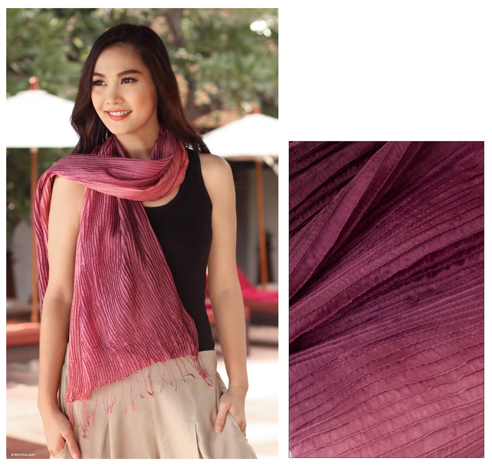 Dyed by hand, this beautiful scarf shades gradually from dark to light mauve. Pin tucks along its length add texture to its enchantment. By Vinita in Thailand, the scarf culminates in delicate fringe.