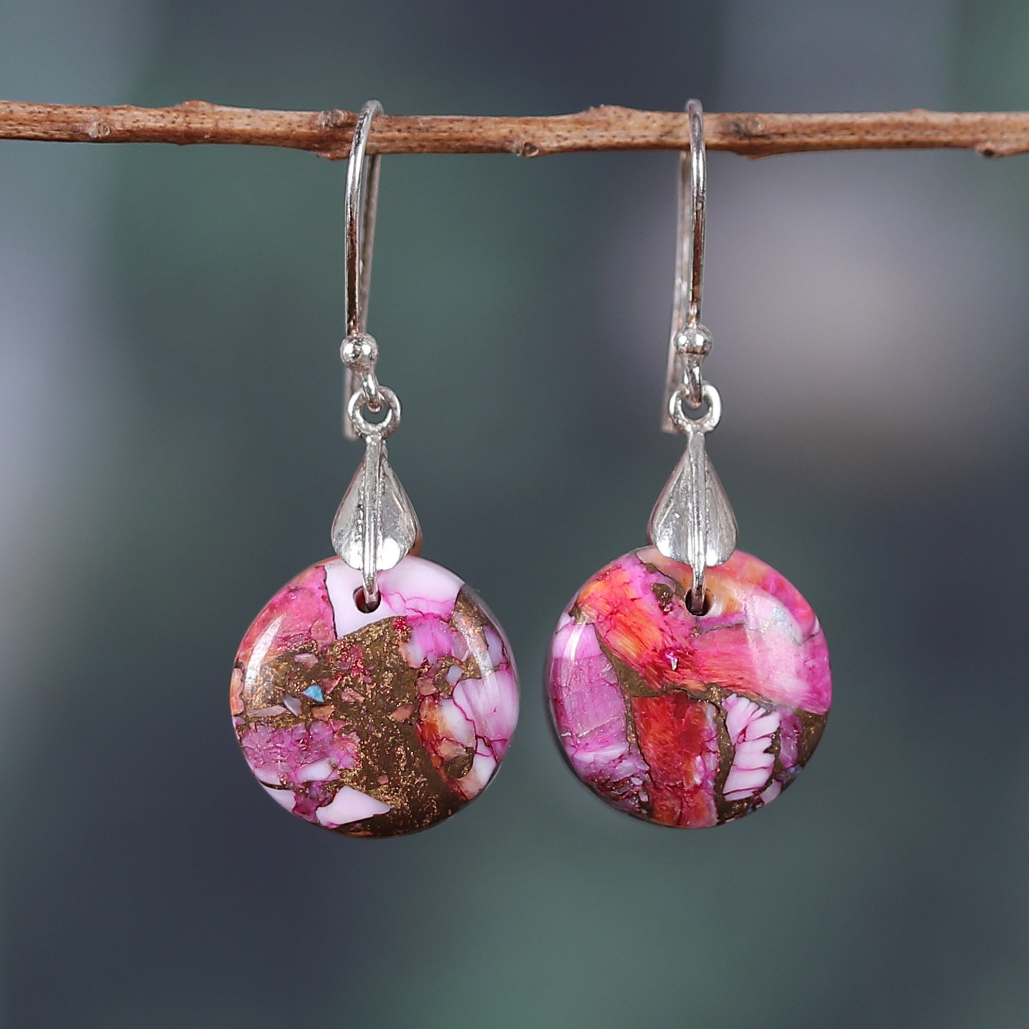 Pink and Red Round Composite Turquoise Dangle Earrings, 'Moon of Sweetness'