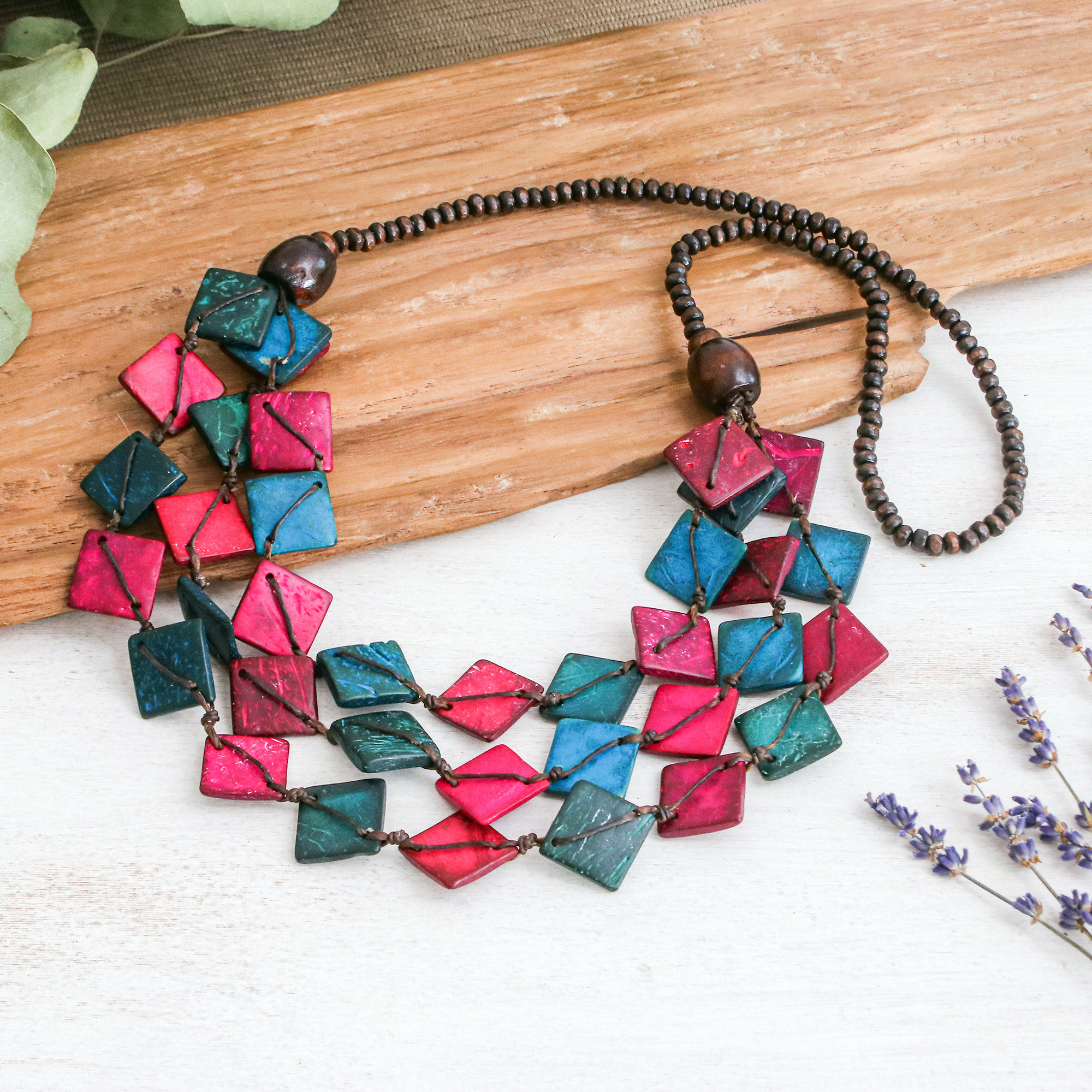 Sumalee Nawakul captures the beauty of a fantasy world in this enchanting accessory, infused with Thailand's traditional artistry. Accented with little leaf wood beads for a bohemian look, this three-strand necklace boasts coconut shell pendants shaped like diamonds and painted in pink and turquoise hues for a dreamy look.