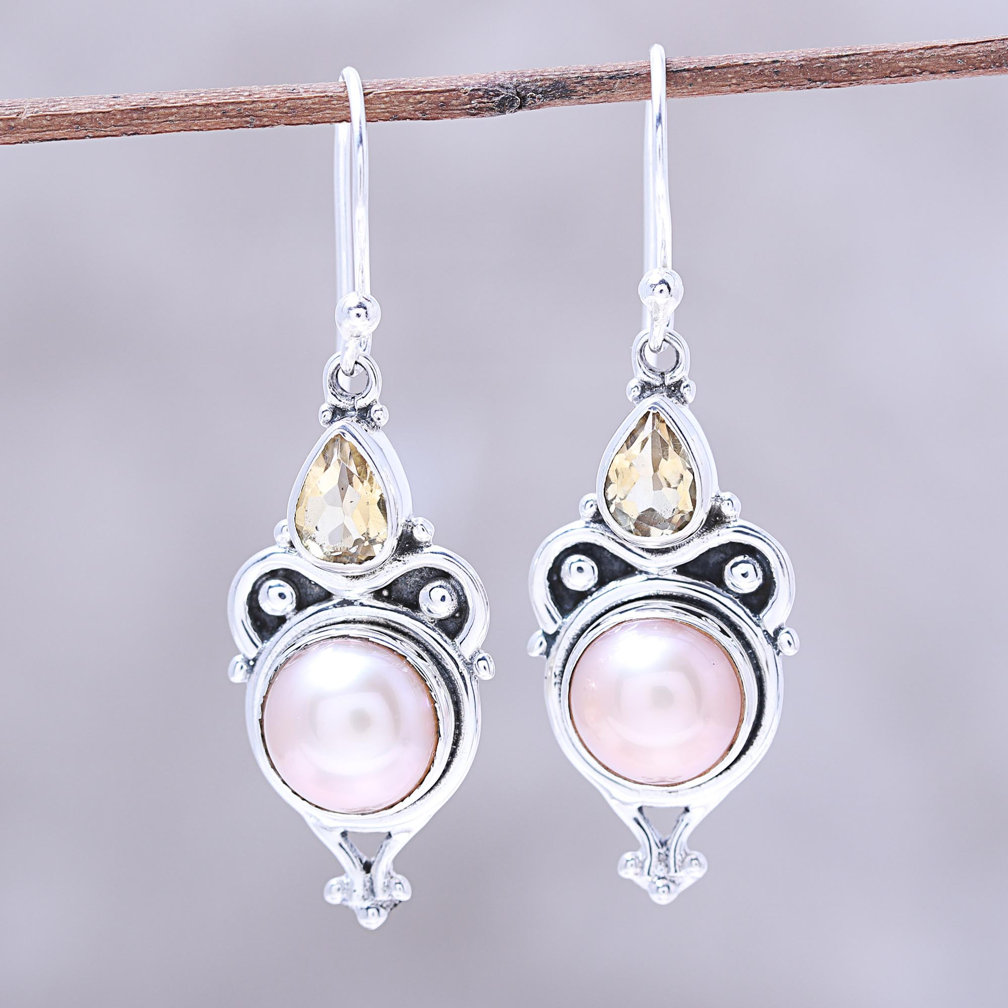 Crafted by local Indian artisans, these dangle earrings will make an elegant addition to your wardrobe. Two round, pink cultured pearls are framed by sterling silver designs with a combination of finishes, complete with sparkling pears of citrine just above. Neeru Goel presents this accessory.