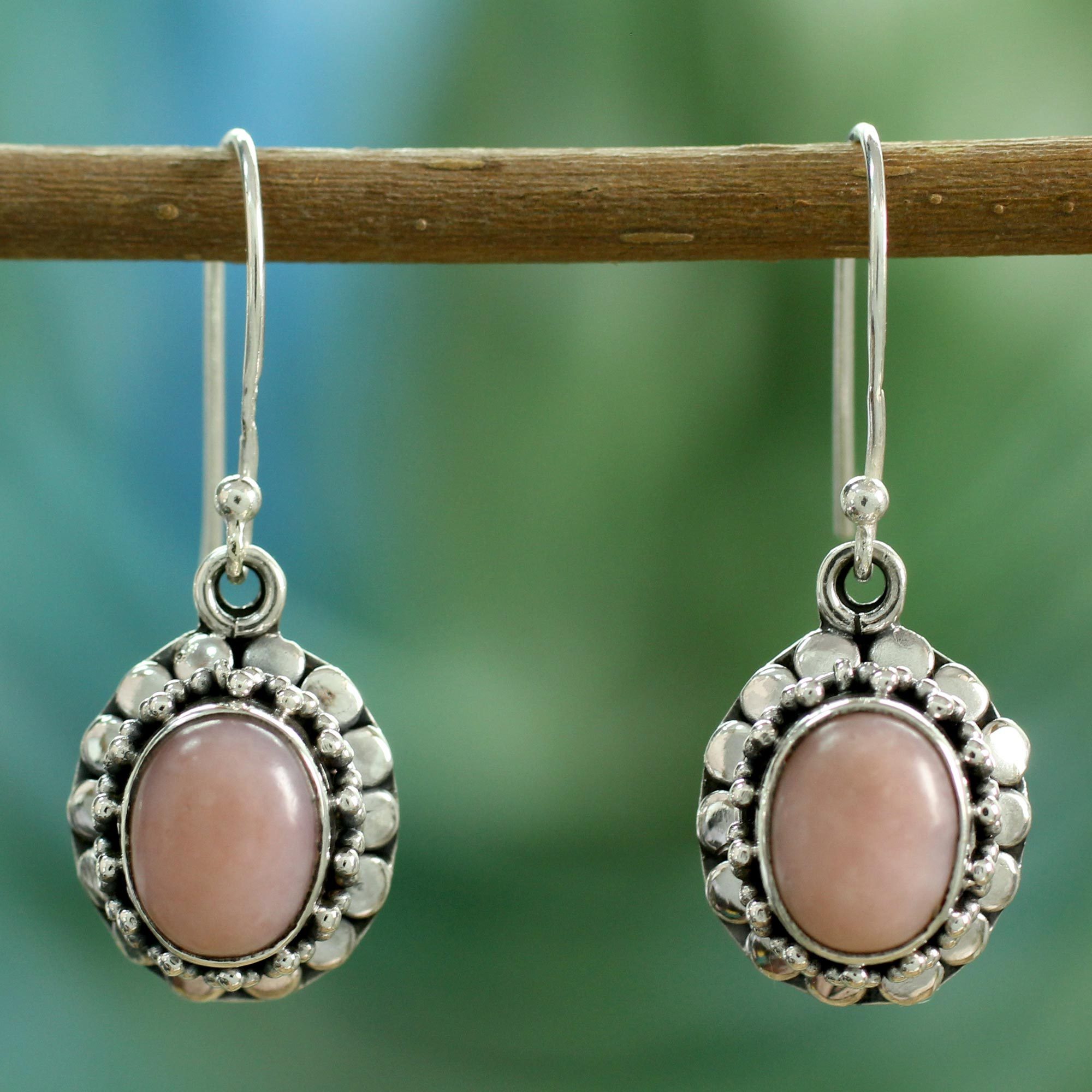 Centering sterling silver flowers, pink opal is the stone of peace and harmony for the aura. Aparna designs and crafts these lovely earrings.