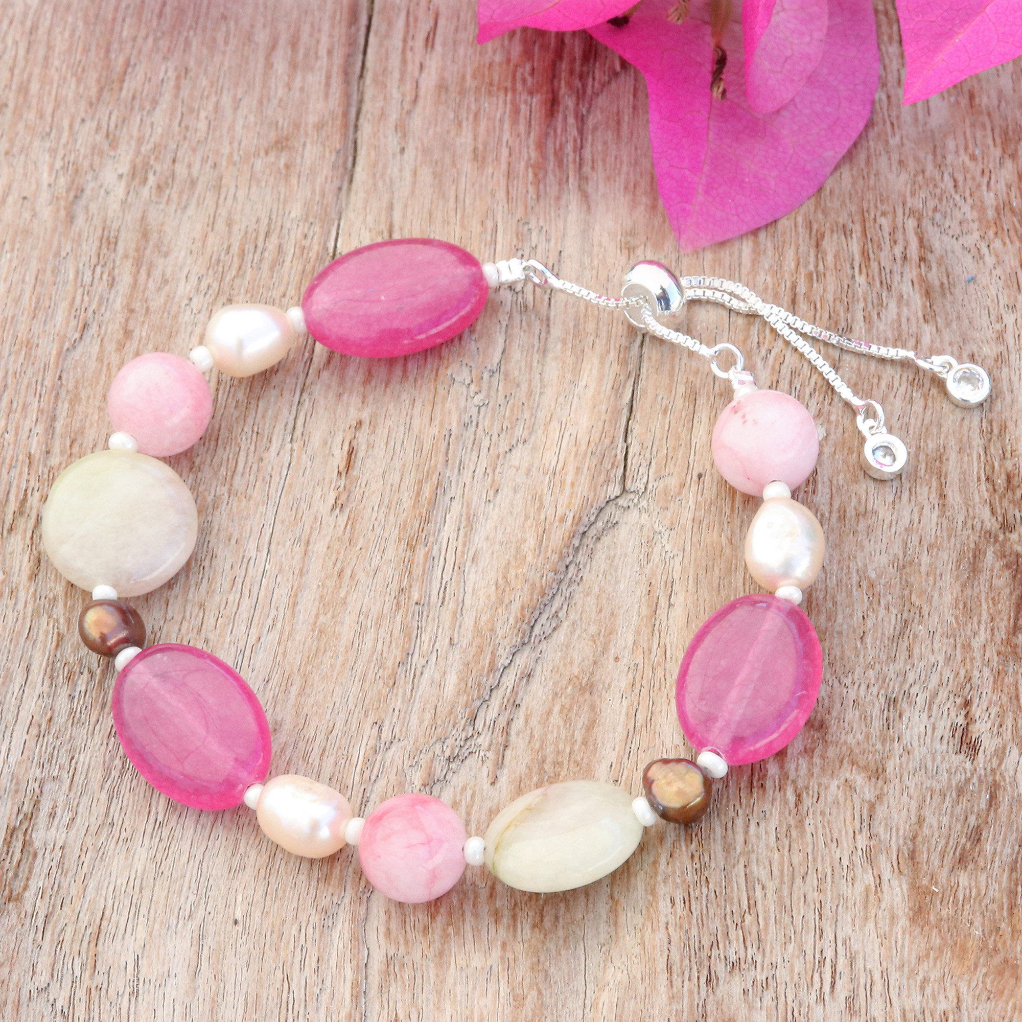 This delicate beaded bracelet from Thailand's Nareerat blooms with the gentle romance of a rose garden at dawn. It beautifully pairs blush pink and light pink quartz with the organic luster of white and brown cultured pearls, complemented by delicate white glass beads set between the larger stones. The lustrous sterling silver-plated slide clasp, adorned with sparkling clear glass accents, lets you adjust this dreamy piece to wrap your wrist in refined, understated beauty.
