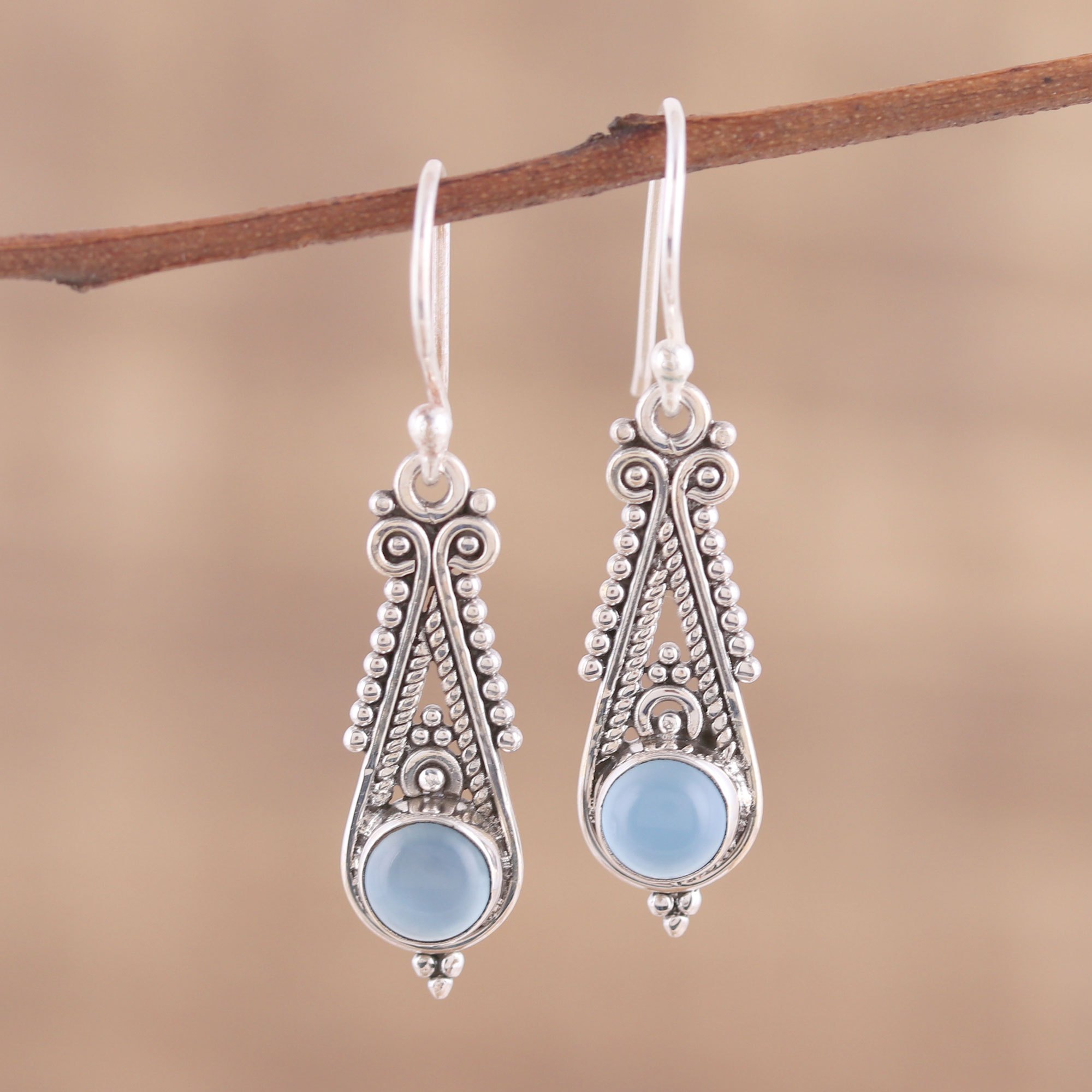 Intricate handcrafted rawa work in sterling silver forms the regal peaks of these dangle earrings from India. Alok Jain works with local artisans to present this accessory, completed with two circular stones of cool chalcedony.