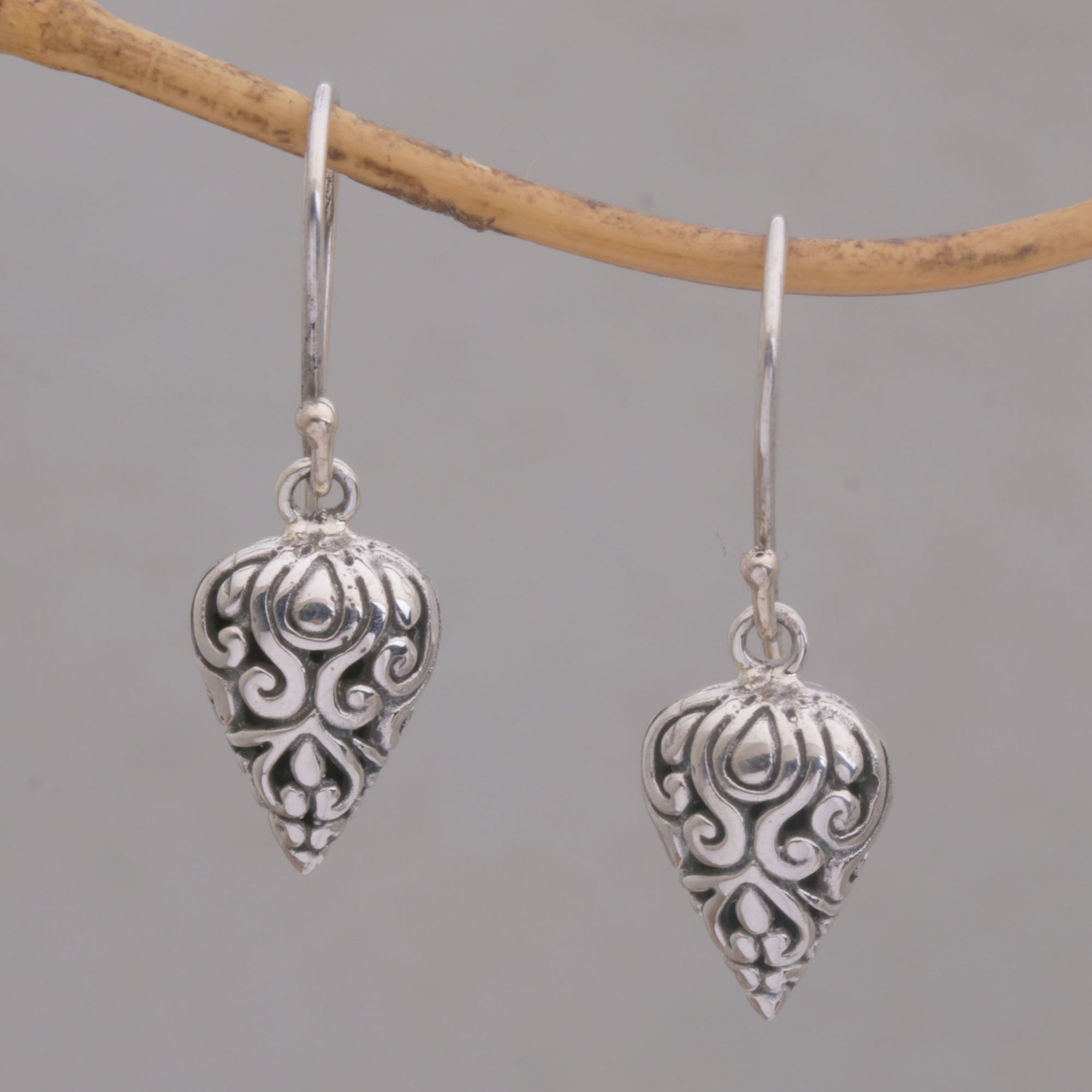 Wayan Asmana proudly presents a regal pair of dangle earrings from Bali in celebration of local craftsmanship. Crafted of sterling silver by local artisans, each earring takes a pointed shape, elaborated with swirling vine patterns.
