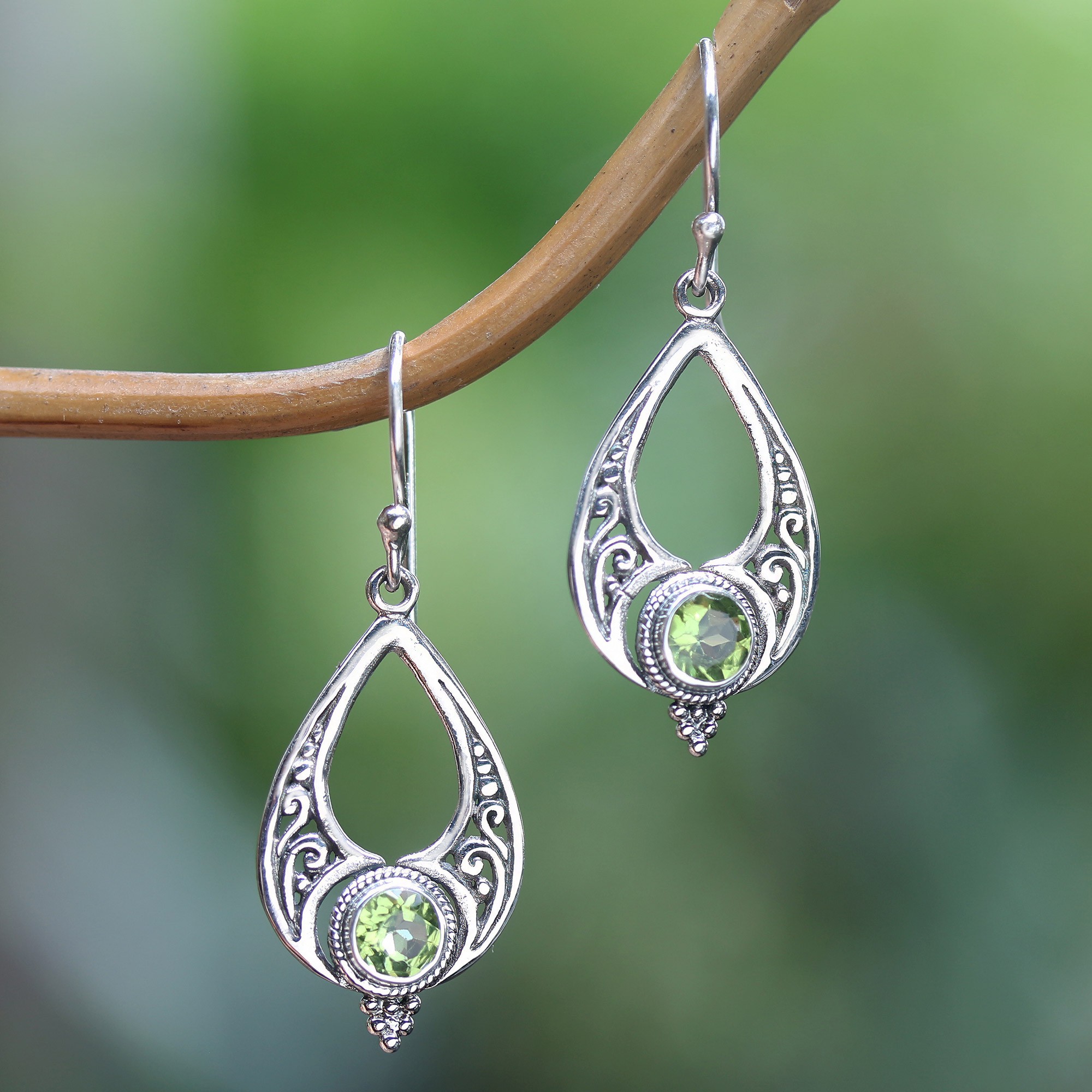 Attract good fortune and harmonious beauty with this lustrous pair by Nyoman Rena of Bali. Boasting the region's exquisite jewelry arts, these drop-shaped sterling silver dangle earrings display sweet floral details in a polished finish, all gracefully arranged around faceted peridot stones totaling one carat.