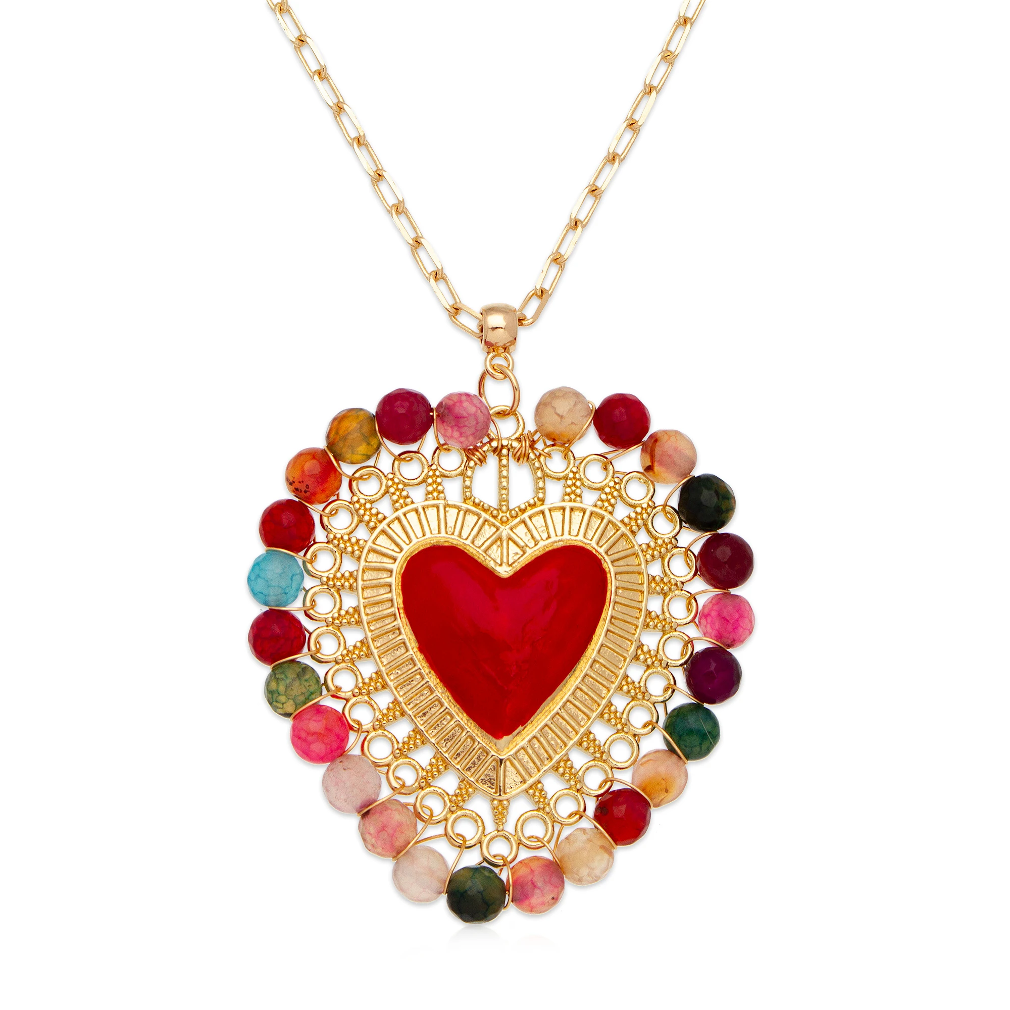 A miracle of tender sensations gives life to this 14k gold-plated piece from Alejandra Aceves of Mexico. Inspired by the region's traditions and strong spirit of hope, this pendant necklace assumes the shape of a stunning heart, decorated with colorful agate stones.