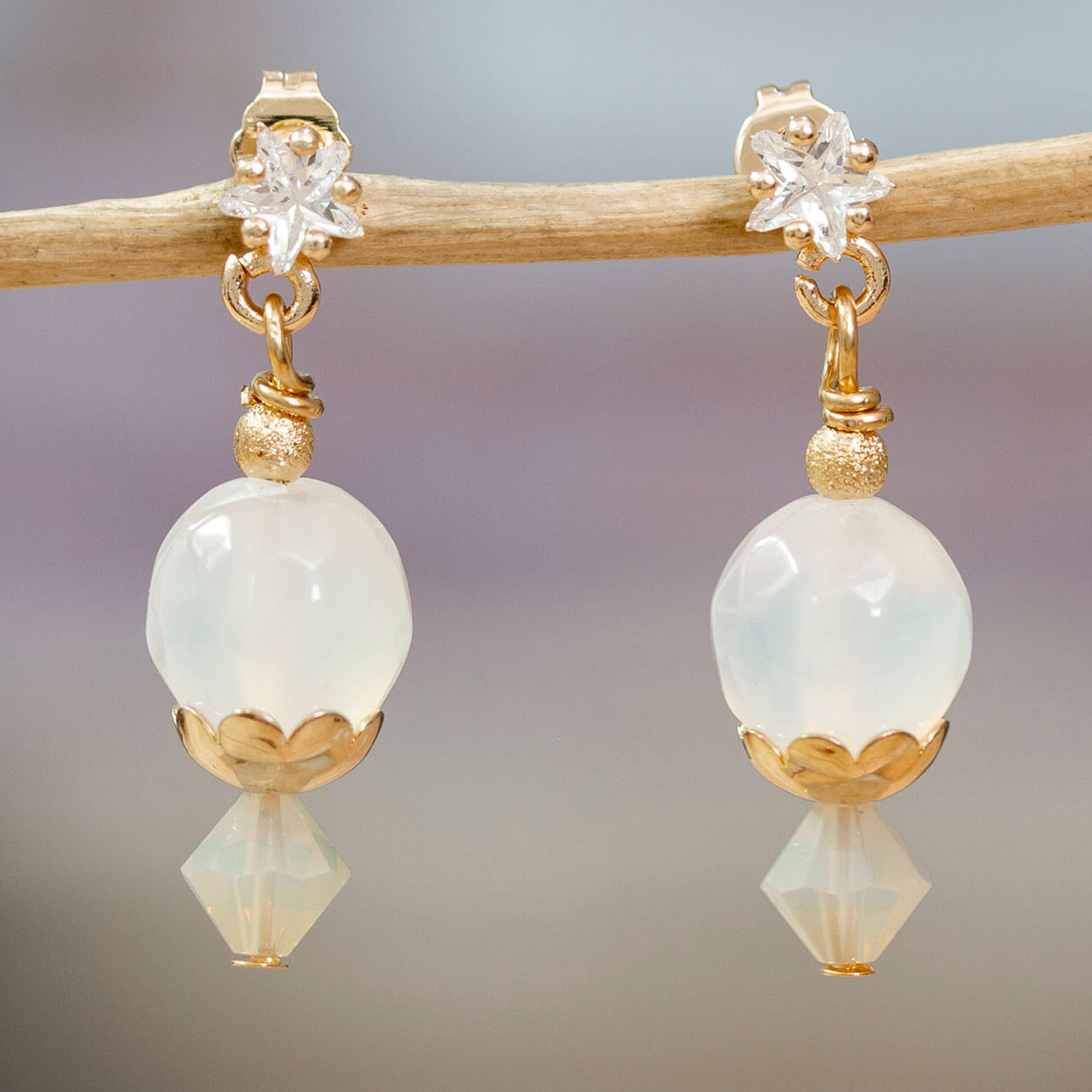 Light and graceful beauty emanate from each element that composes this sublime pair by Mexico's Alejandra Aceves. The artisan shows her talent and expert eye for jewelry arts in these 14k gold-plated dangle earrings, whose classic structure elegantly holds agate, aventurine and Swarovski cubic zirconia jewels—all dazzlingly arranged to create a captivating design.