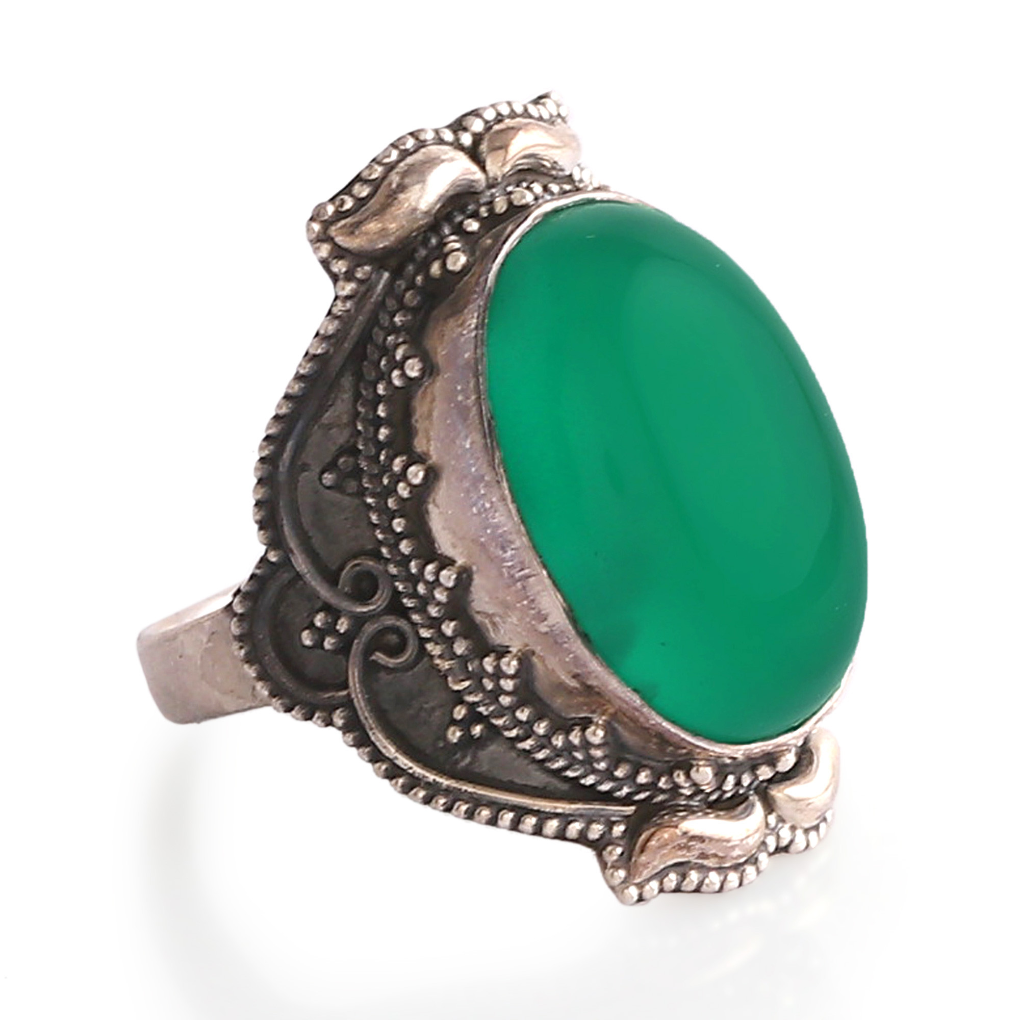 Travel to an era of grandeur with this classic sterling silver cocktail ring. Presented by Alok Jain and crafted by master artisans, this palatial piece seduces with classic details and a combination of polished and oxidized finishes. To crown the design, a green onyx cabochon shines at the front with harmonious beauty.