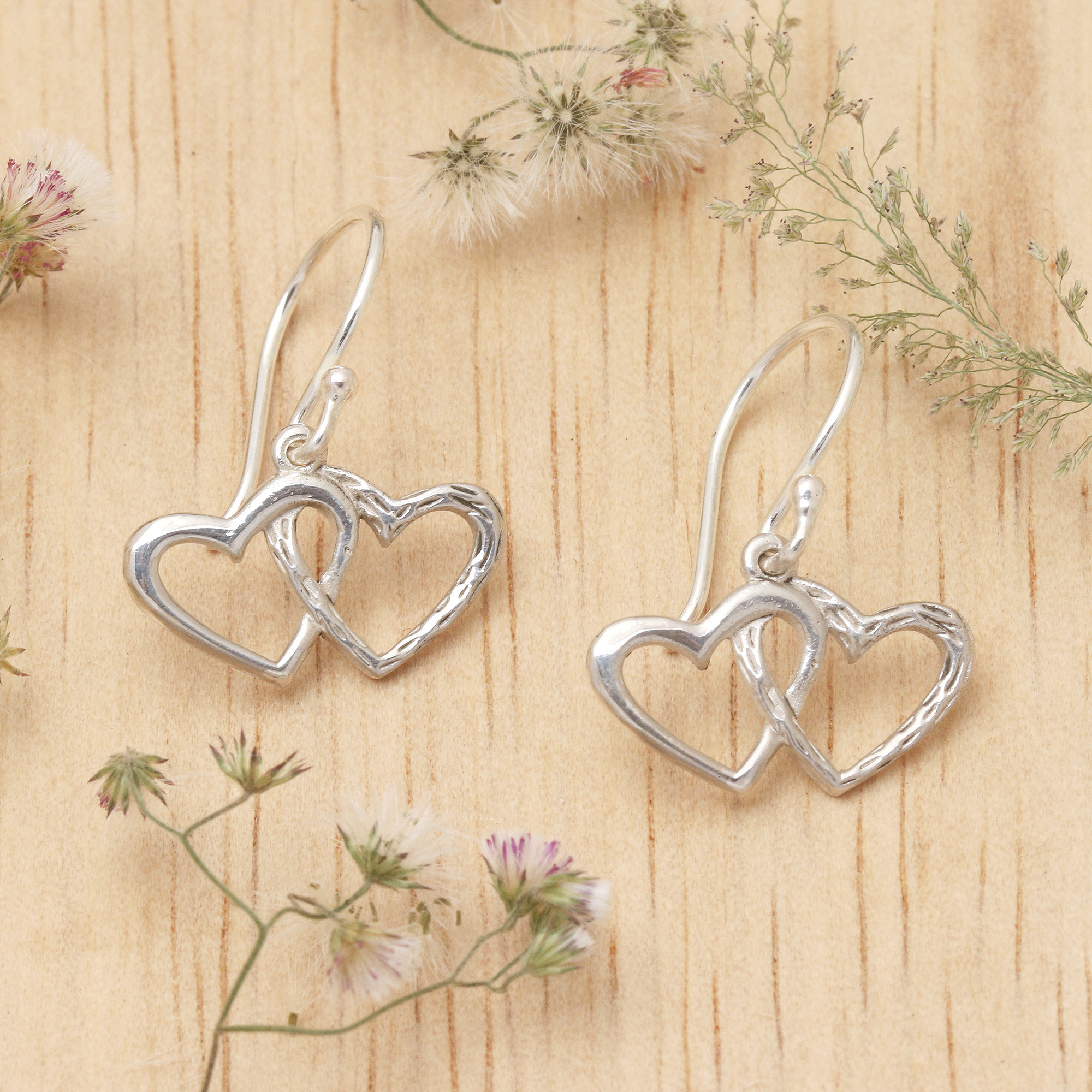Polished and Textured Sterling Silver Heart Dangle Earrings, 'Joined Love'
