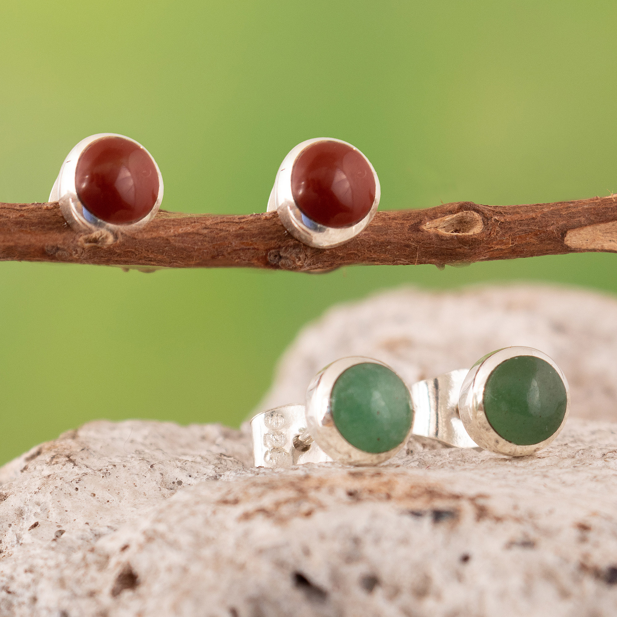 Peruvian artisan Fermin works with precious aventurine and jasper jewels to create a pair of luminous designs for a mystic fashion statement. After making the sterling silver structures, the artisan creates these button earrings in a polished finish, one in a warm hue attracting emotional balance and the other in a cool hue symbolizing perseverance.