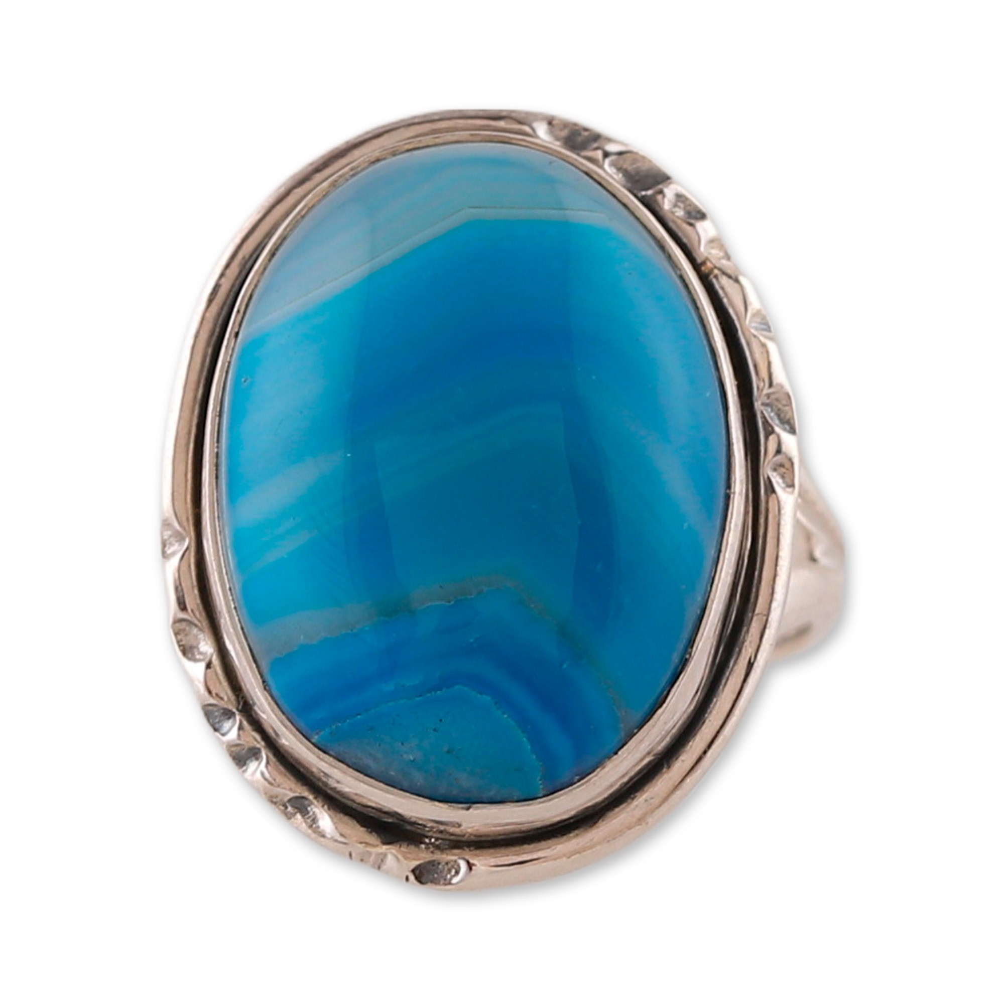 Serene and celestial sensations awaken in this breathtaking accessory from the prosperous Indian lands. Artisan Rakesh Rana displays exquisite artistry in this sterling silver cocktail ring, whose classic structure in a polished finish is enriched by the ethereal beauty of a blue agate cabochon in intense hues.