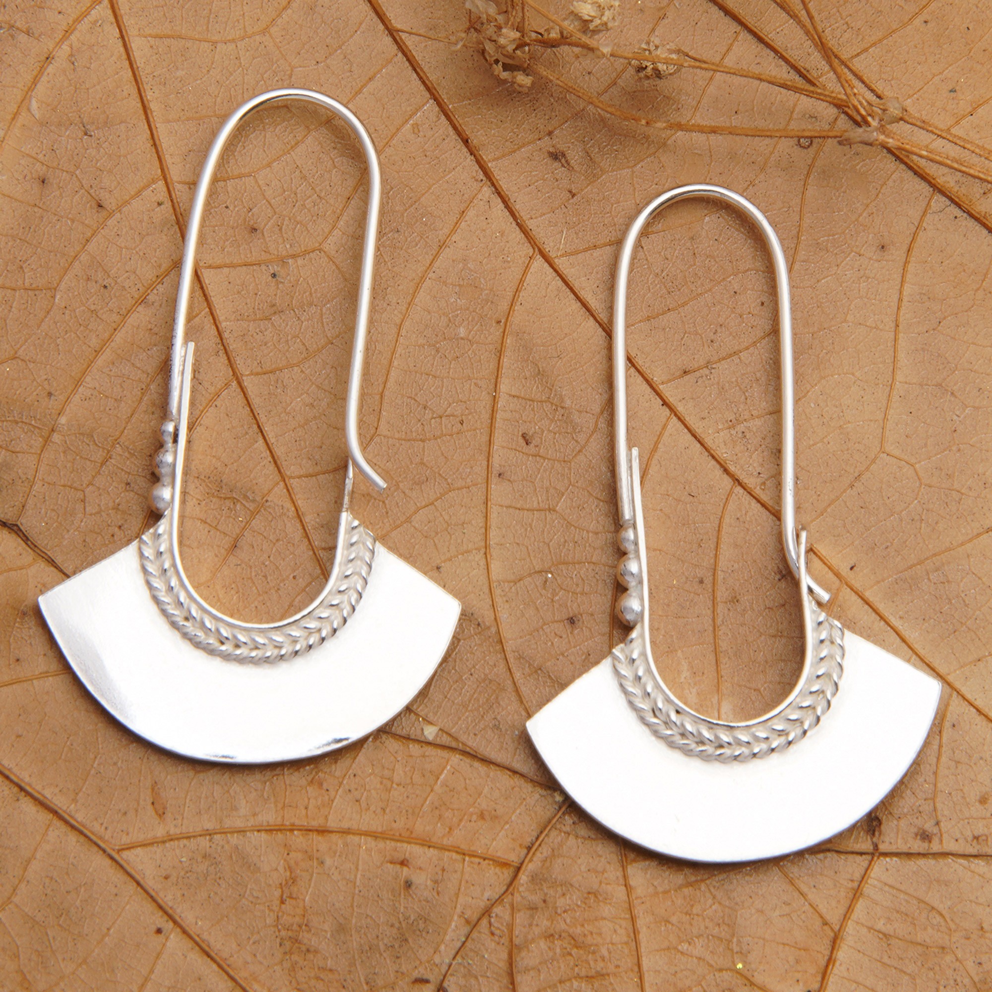 Polished Fan-Shaped Sterling Silver Hoop Earrings from Bali, 'Fan Age'