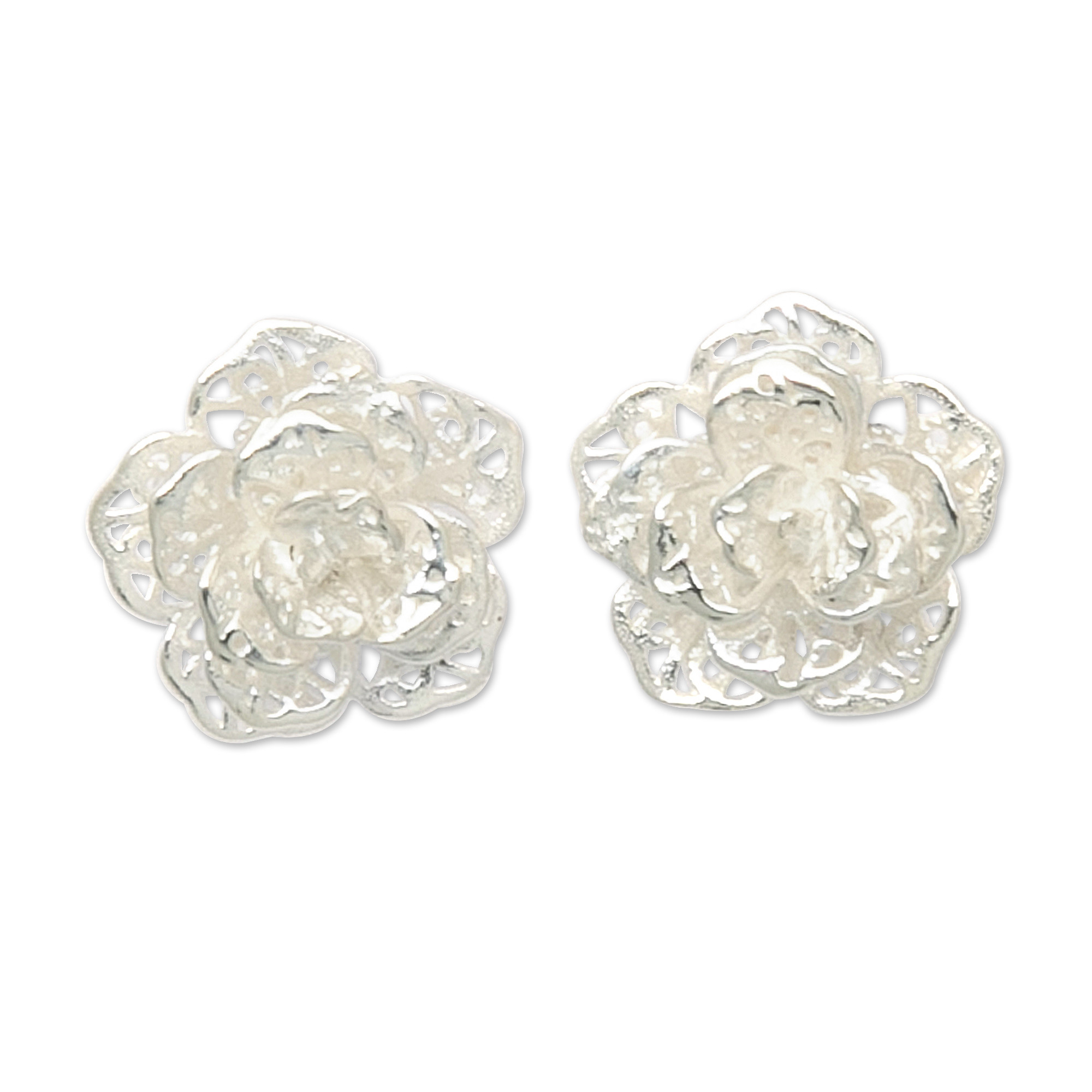 Polished Floral Sterling Silver Button Earrings, 'Wintry Rose'
