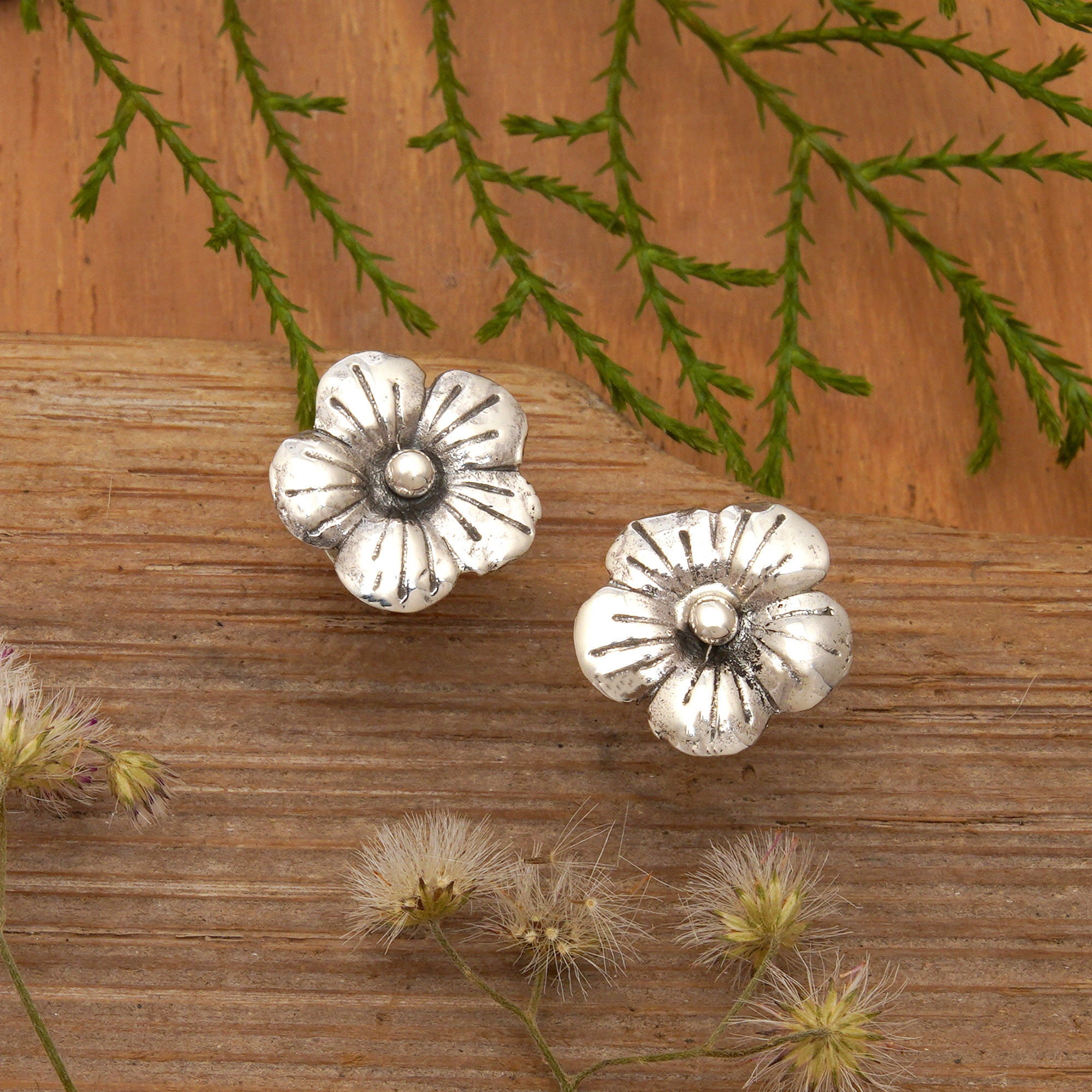 Tiny petals open the door to a great world of stunning styles. Made to be a versatile piece of jewelry, this sterling silver pair of button earrings by Bali's Anya adds the region's floral touch to your days. Polished for a lustrous look, each pendant assumes the shape of little hibiscus blooms.
