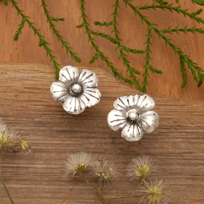 Polished Floral Sterling Silver Hibiscus Button Earrings, 'Tiny Spring'