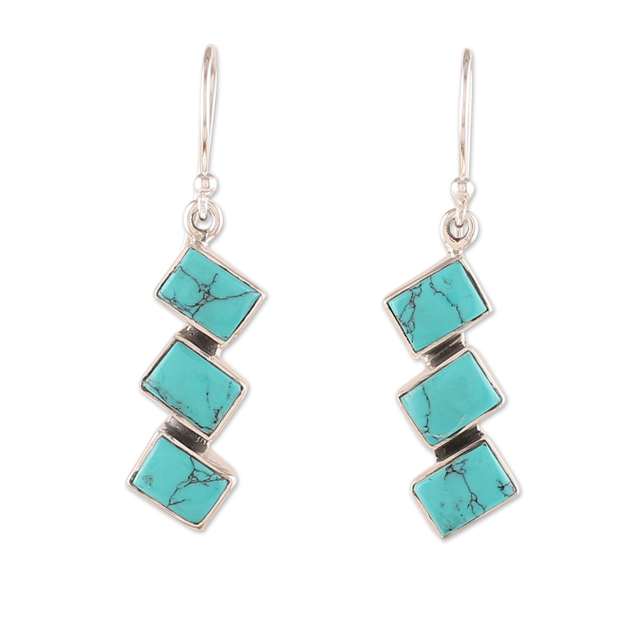 Climb these ladders to reach a serene world of healing energies, presented by Neeru Goel. Crafted by Indian artisans with exquisite expertise in jewelry arts, these sterling silver dangle earrings showcase a glorious geometric design that embraces calcite jewels, whose rectangular shapes shine with a palette of luminous and calm colors.