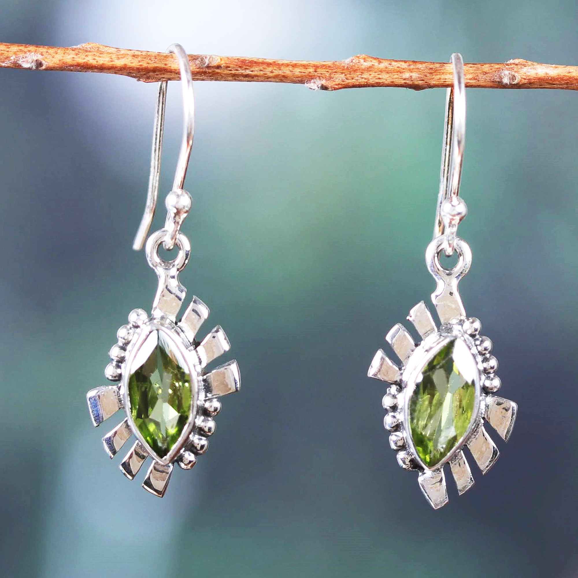Sharp sterling silver formations and little classic accents beautifully embrace natural marquise-shaped peridot stones totaling two carats. Narayannii's dangle earrings shine with a refined green light, all thanks to their polished finish. In addition, the jewels are a famous amulet of good fortune, adding a mystic touch to this wondrous design from India.