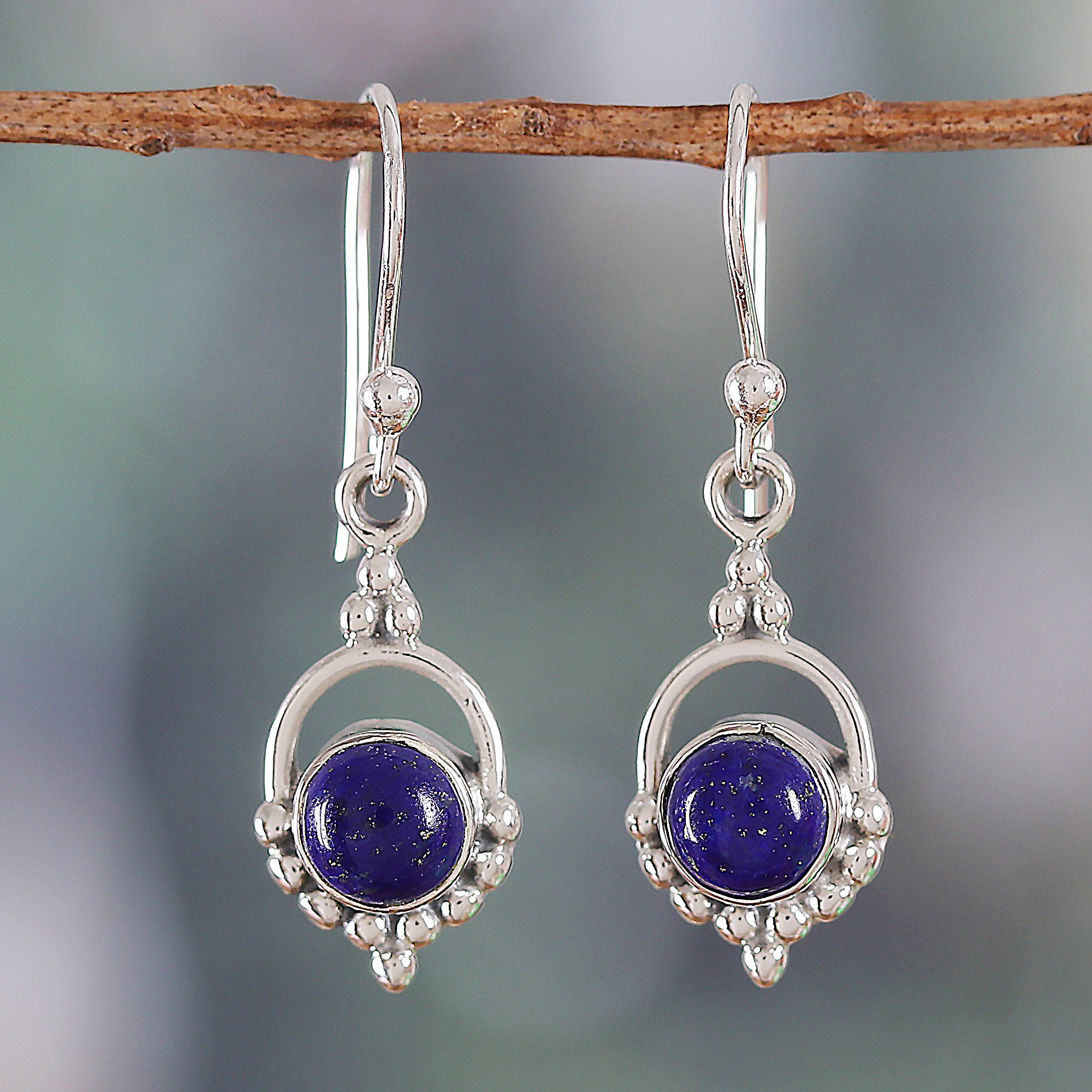 Majestically adorned with advanced silversmithing, Narayannii's design boasts the beauty of lapis lazuli cabochons, symbolizing royalty and intellect. Crafted by local Indian artisans with expertise in jewelry arts, these sterling silver dangle earrings in a polished finish complement the gems' magical charm with classic accents that exude grace.