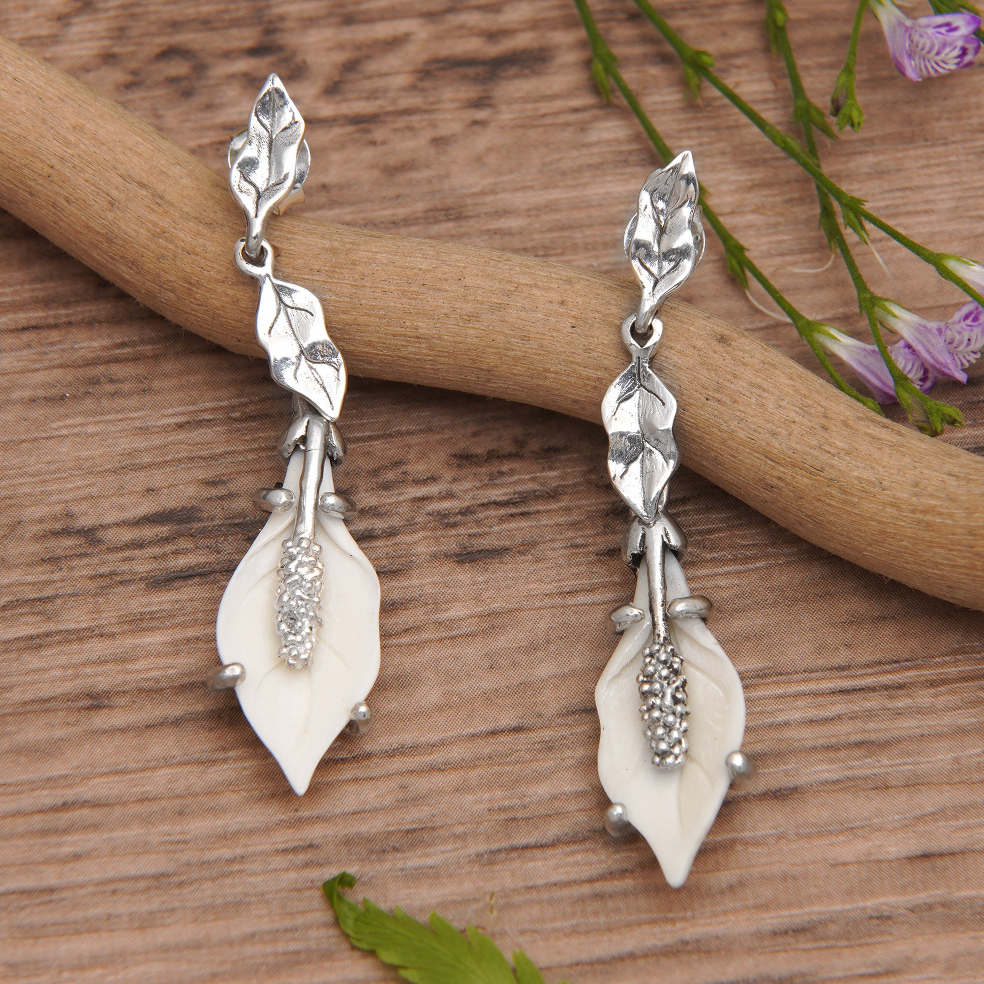Inspired by nature and made to call for unity, Balinese artisan Arta Pradana's sterling silver dangle earrings feature a magical vibe thanks to their exquisite floral details. Accented with carved bone blooms, the accessories imitate a lily's graceful essence, a known symbol "that describes purity, modesty, and peace," as the artisan explains.