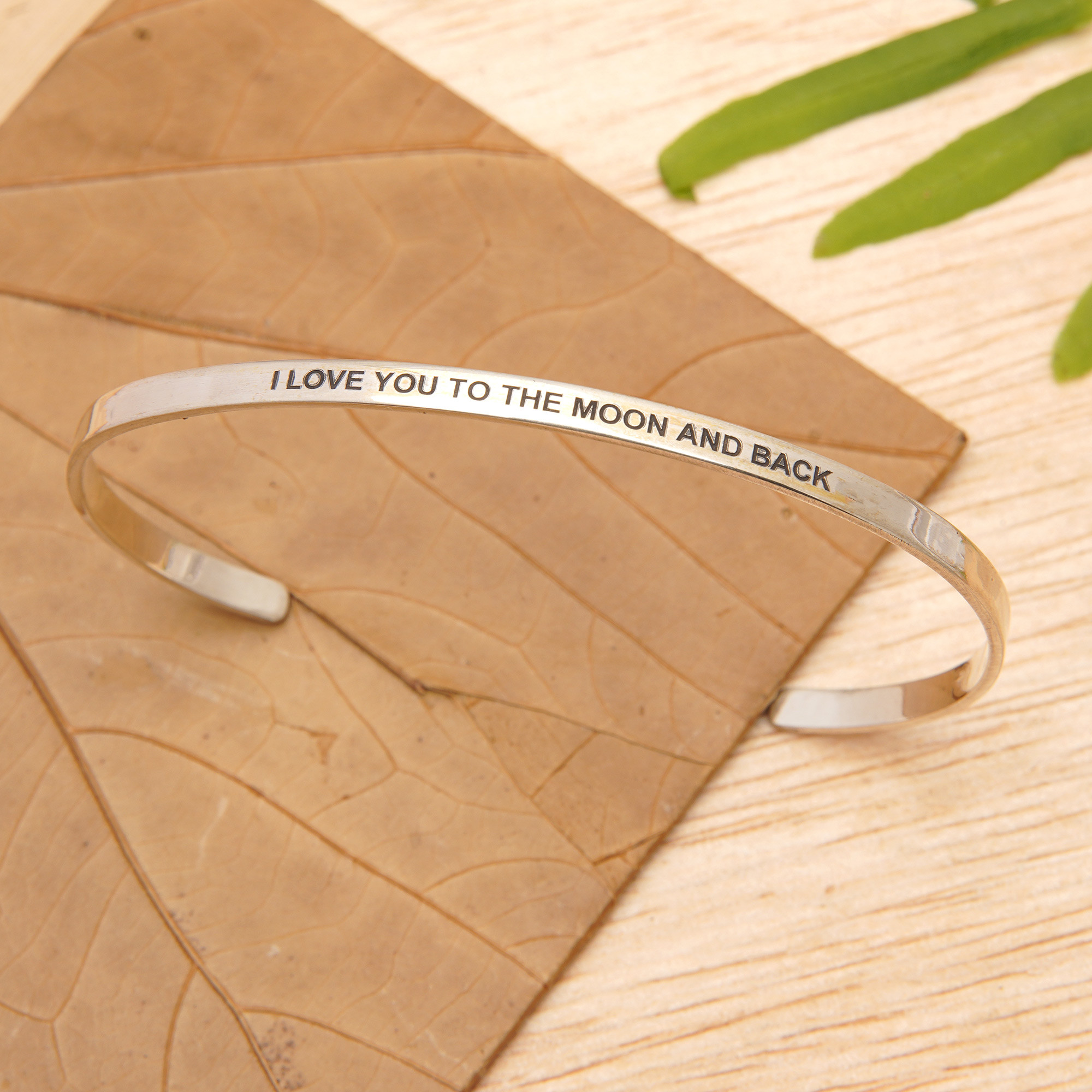 Your love can be expressed through different aspects of life, allowing you to make each moment a passionate one. Inspired by minimalist trends and determined to show your love philosophy, Balinese artisan Griya Suarningsih uses sterling silver to create this elegant cuff bracelet aimed at those souls living in a romantic reality, as it arrives with the phrase "I love you to the moon and back" engraved at the front.