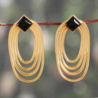 Polished Oval Brass and Black Onyx Drop Earrings from India, 'Midnight Echo'