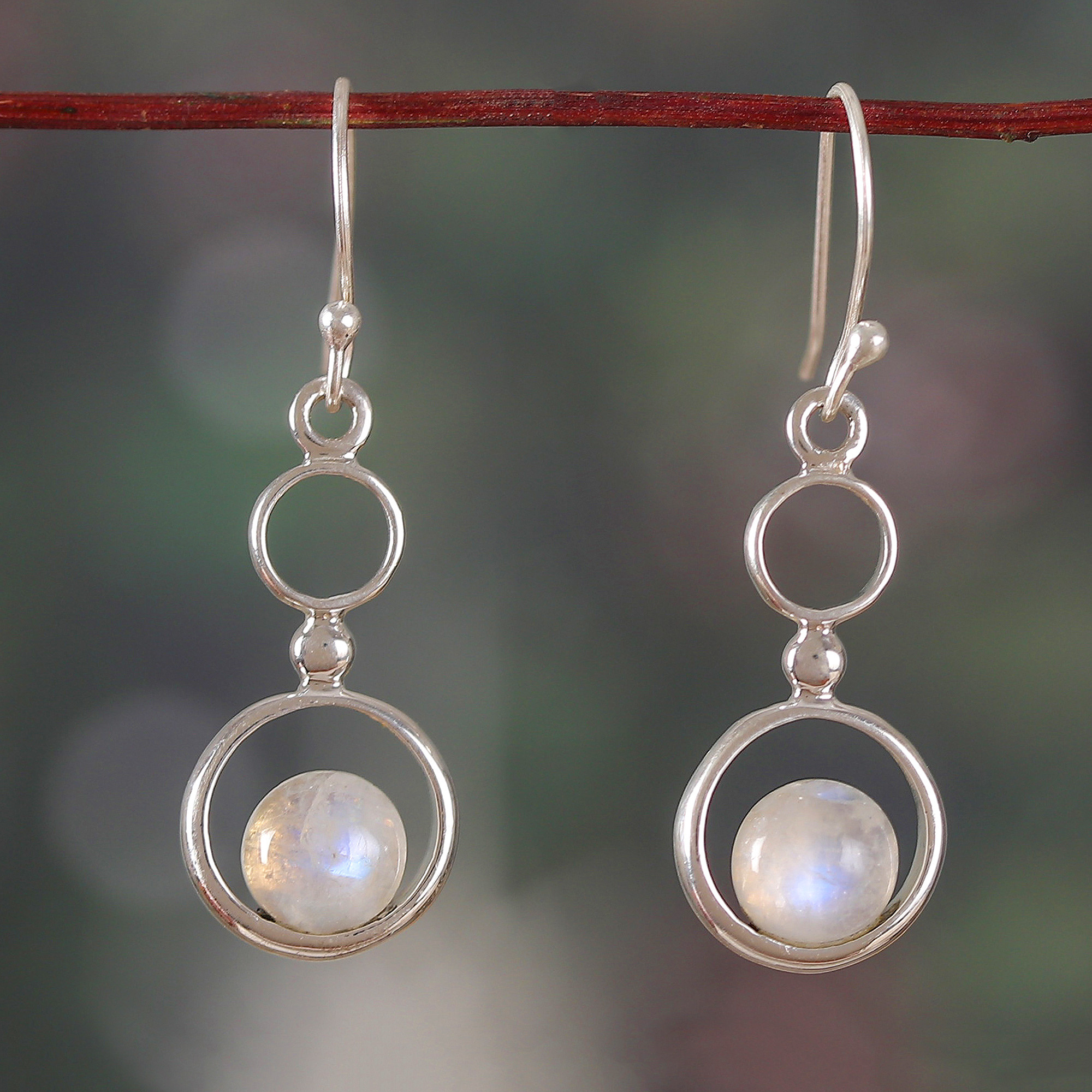 Gleaming sterling silver meets the luminous charm of rainbow moonstone in these elegant dangle earrings where sleek metalwork highlights the gemstones' natural brilliance. Presented by Chintan of India, this stunning design embodies sophistication and perfectly complements both casual wear and evening attire.