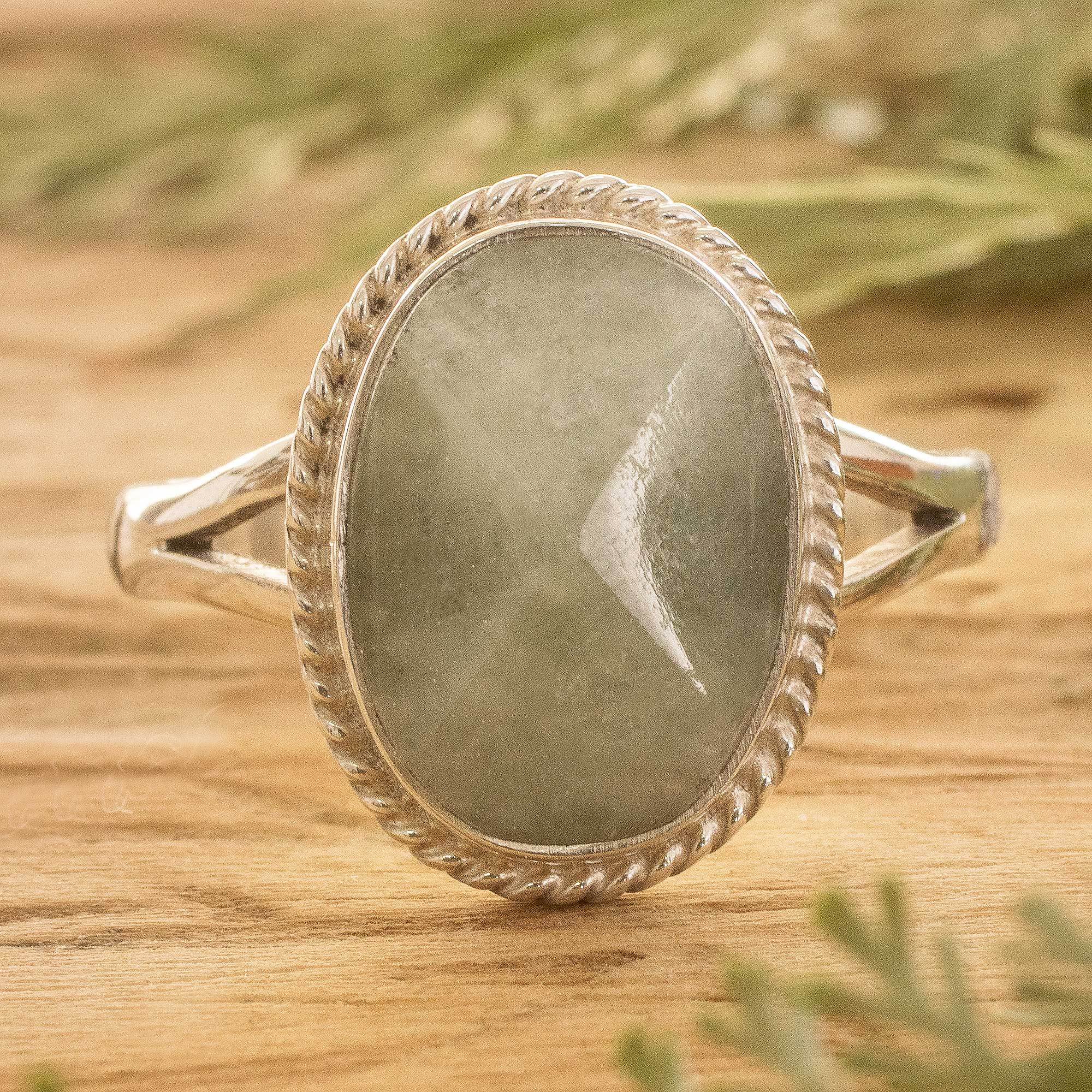 As the stone of serenity and vitality, this green jade cabochon adds a mystic aura to a refined design made for a dazzling formal or casual occasion. Zandra Lorena Sajbin from Guatemala crafts this polished cocktail ring using sterling silver, which allows her to create braided motifs around the jewel.