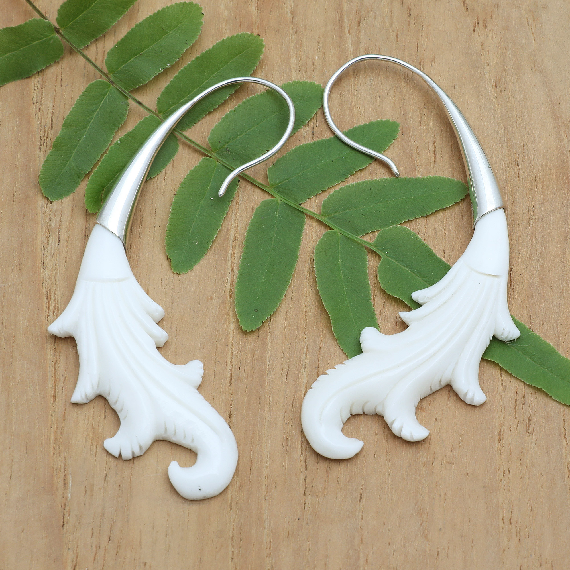 Windy formations in a natural white hue add a heavenly vibe to these drop earrings crafted in Bali by Ayu Ary. As an expert in metalworking techniques, the artisan crafts high-polished structures from sterling silver, both holding bone-carved pendants, creating a refined accessory you will wear anywhere.