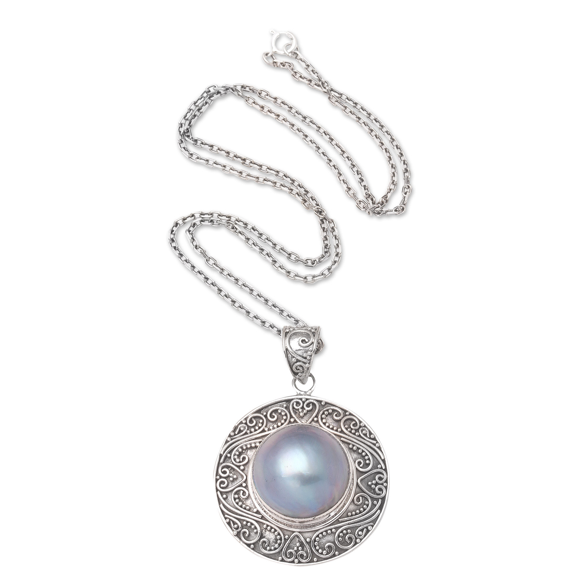 Capturing the classic essence of Bali, artisan Yuniati creates this splendid pendant necklace with a polished finish that enhances its intricate design. The artisan, an expert in metalworking techniques, uses sterling silver to craft the pendant's round structure, adding traditional motifs that enrich the precious blue cultured pearl that adorns the center, symbolizing peace and calm.