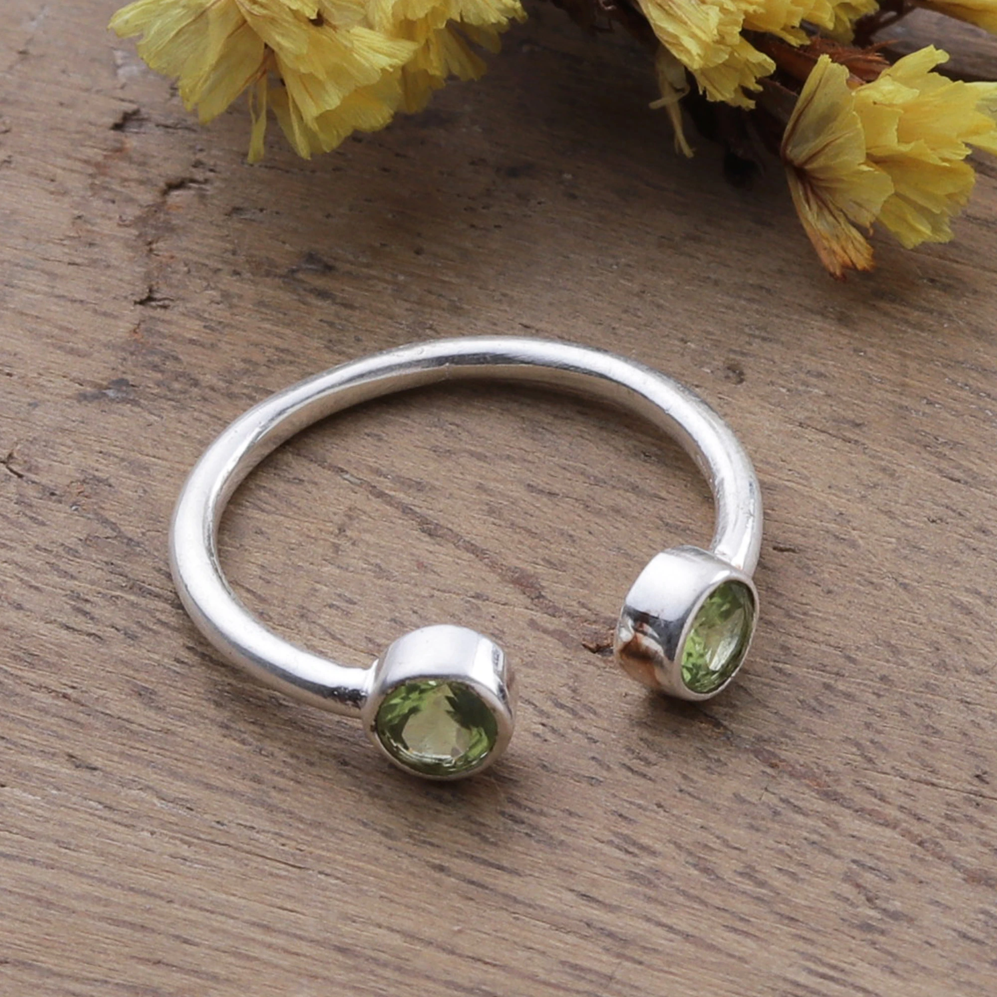 Two scintillating peridot stones crown this gleaming sterling silver wrap ring from India. Shivani Choudhary's stylish creation perfectly blends a classic design with a modern, minimalist allure, ensuring you will steal the spotlight every time you wear it.