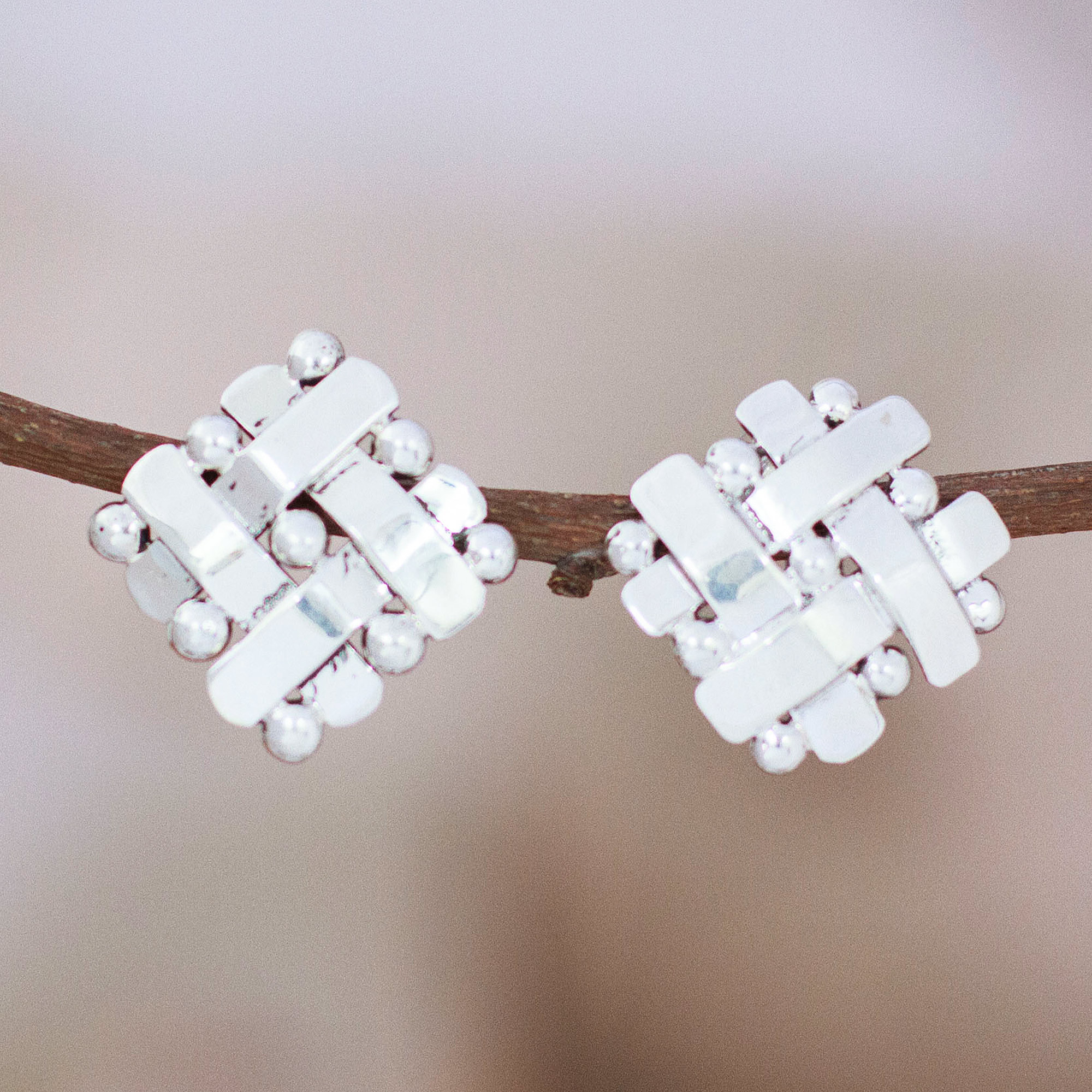 The majesty of sterling silver takes an elegant turn in a design made with traditional Taxco silversmith techniques. Roy Nilson, from Mexico, designs and crafts this shiny fashion statement, whose high polish finish allows for a unique look, all captured in the intertwined and beaded pieces composing these button earrings.