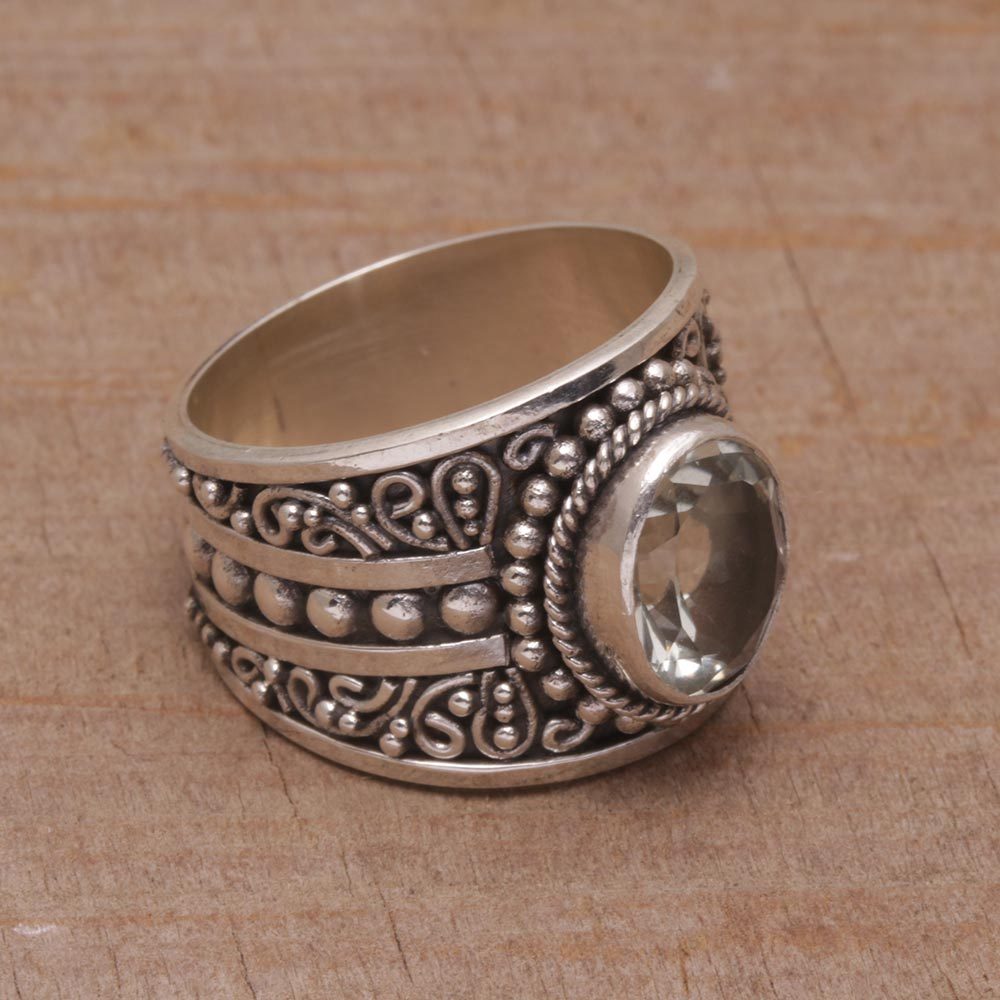 Crowned by a one-carat stone of sparkling prasiolite, this Balinese ring is crafted of sterling silver by local artisans, who elaborate the band with bubble and swirl motifs. Kadek Wijanegara presents the single stone ring named Celuk, after an Indonesian artisan village.