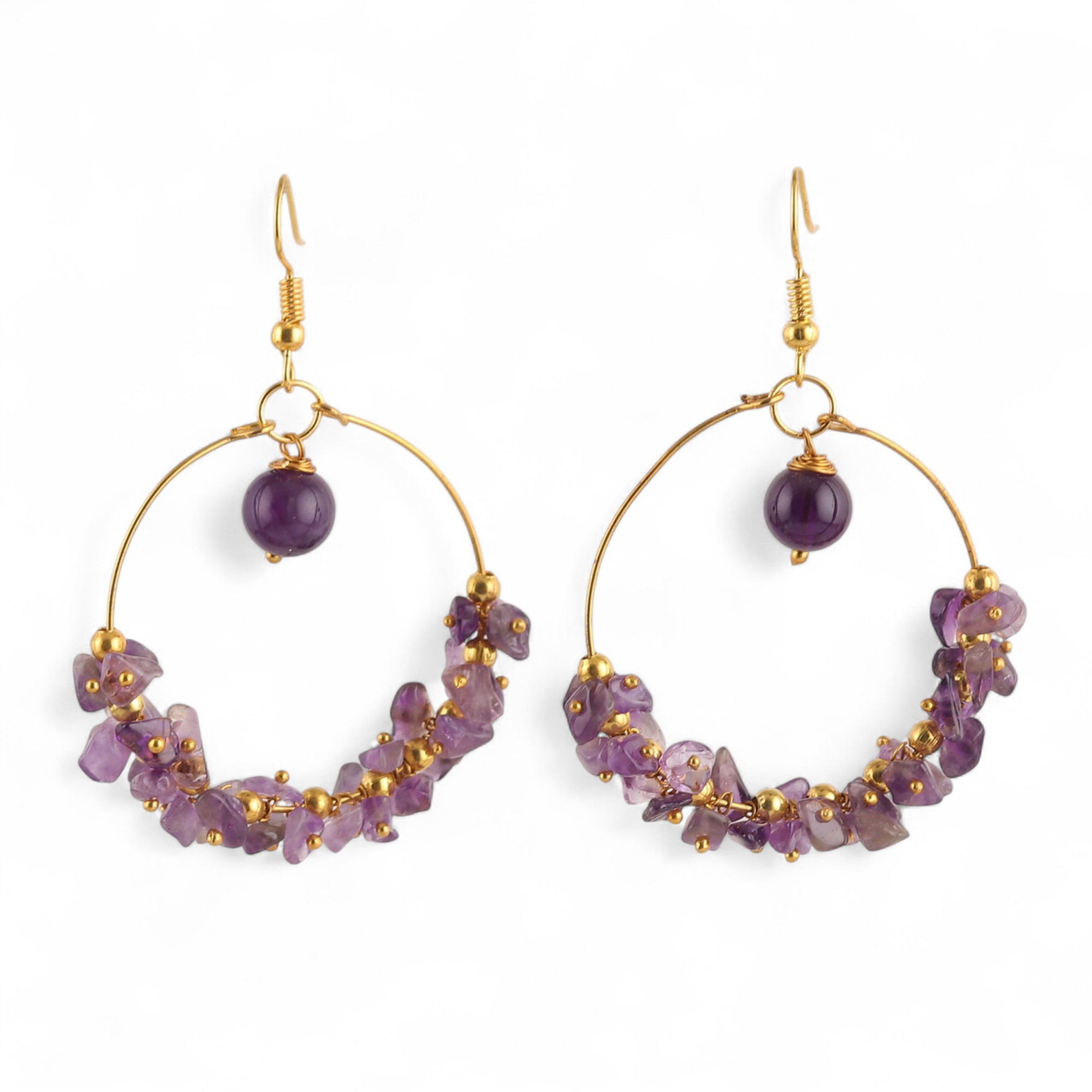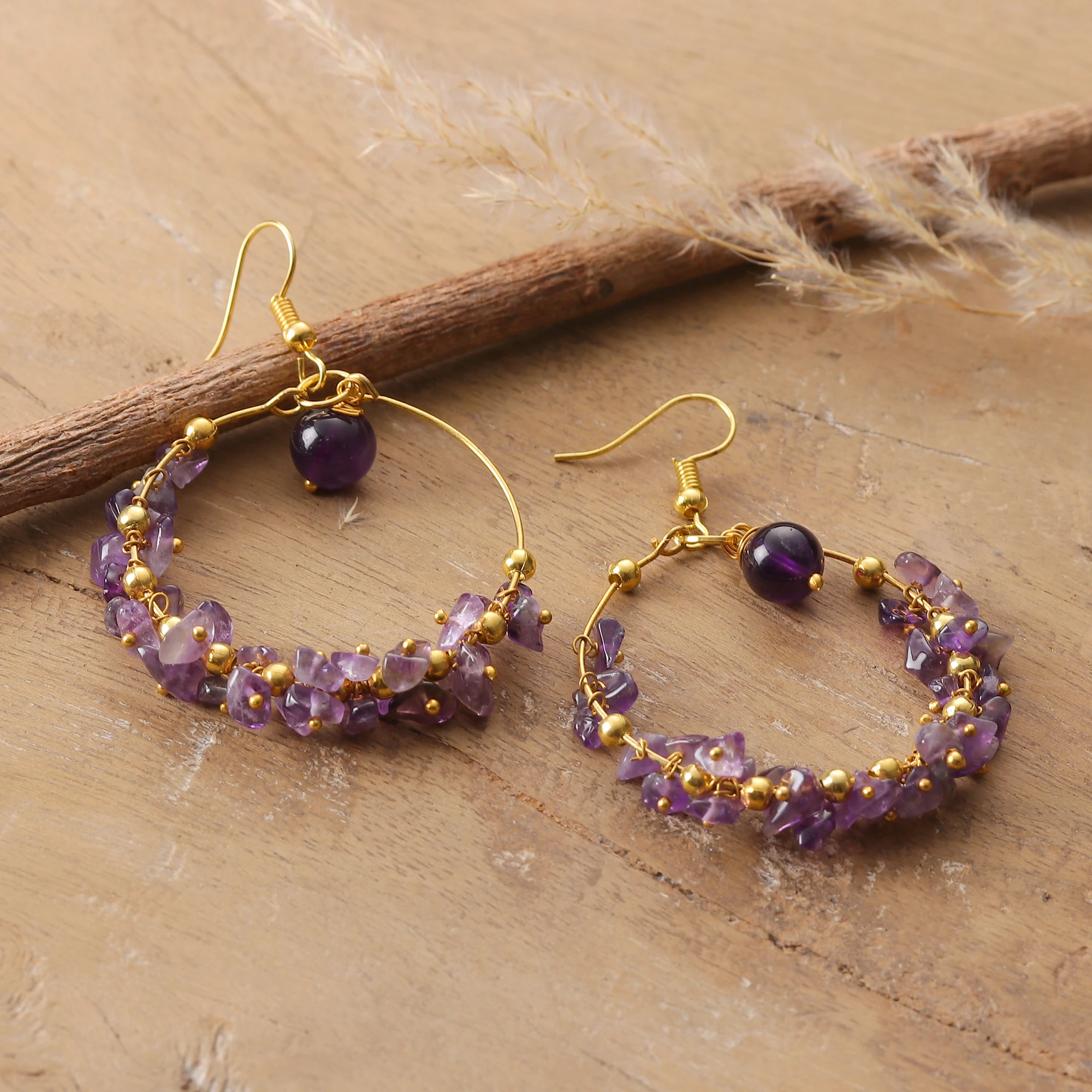 Turn heads with these enchanting amethyst statement earrings by Indian designer Swasti Jain. Bent electrophoretic-coated iron wires create a chandelier-style framework that supports and showcases the stones' magical lavender hue, forming an elegant spectacle that balances modernity with feminine appeal.