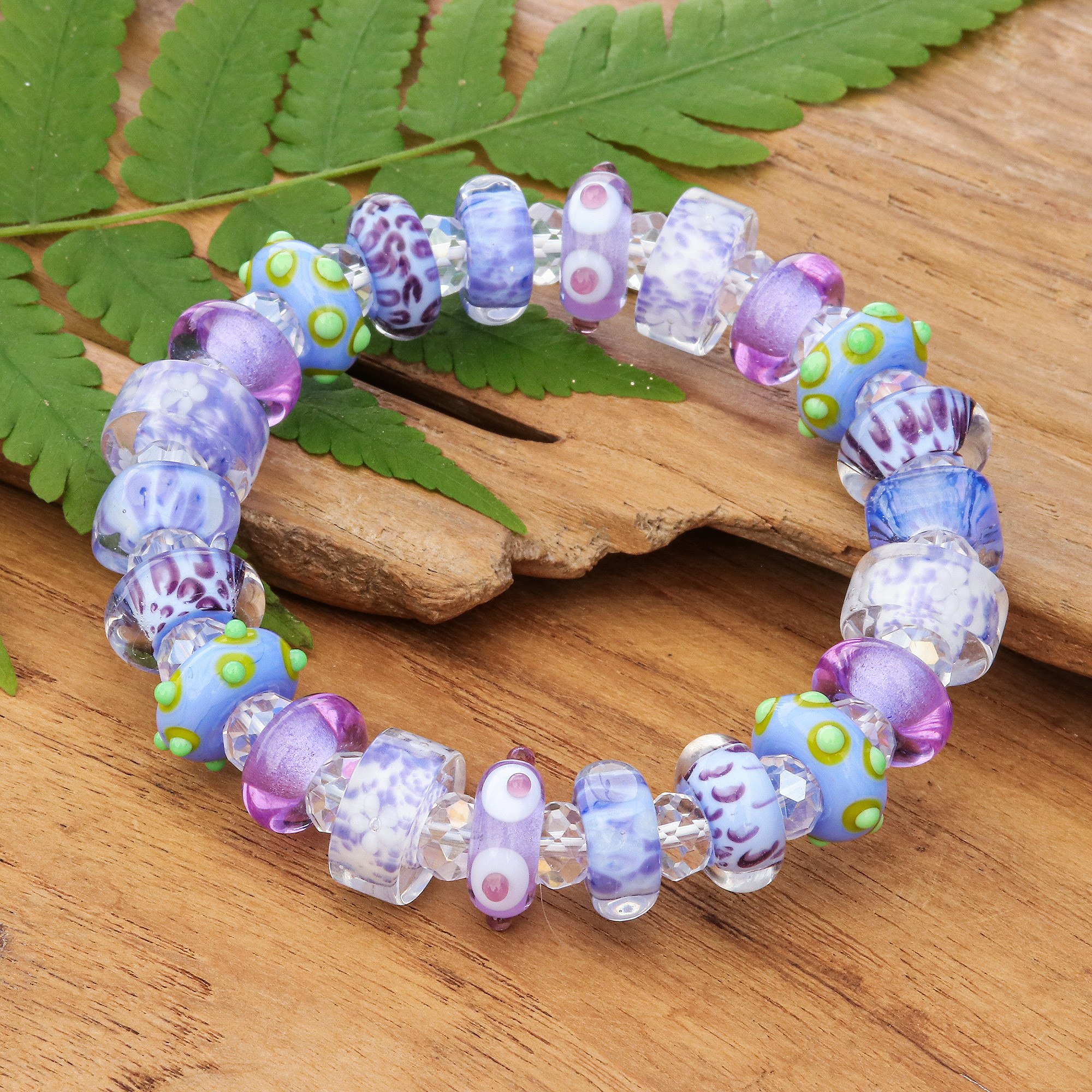 Add effortless charm to any look with this stretch bracelet that brings together rich colors and artistic patterns. Handblown with care by Thai artisan Alexx Cheng, each purple, white and green bead offers a peek into a world of craftsmanship and creativity. Easy to slip on, this wearable masterpiece also features faceted crystal beads.