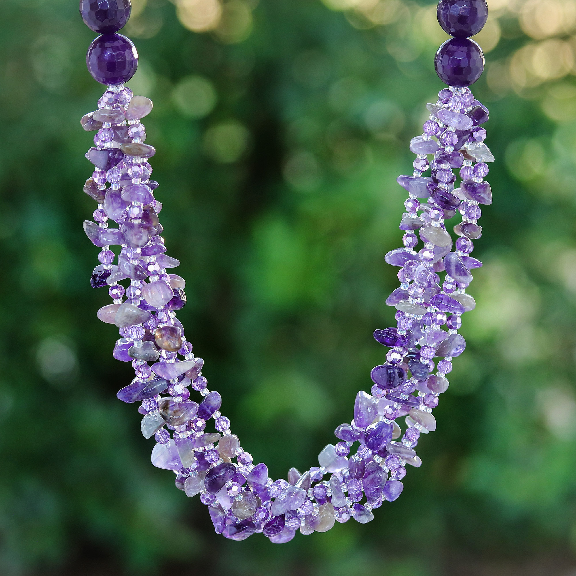 Does your spirit vibrate to the tune of a wise, spiritual and mystic heart? Then Nareerat's newest creation is made for you and your unique essence! Working with sterling silver-plated accessories, the Thai artisan creates this stunning strand beaded necklace, whose dazzling look is composed of natural amethyst, chalcedony, quartz and glass beads in a lovely purple hue, the hue of wisdom and spirituality.