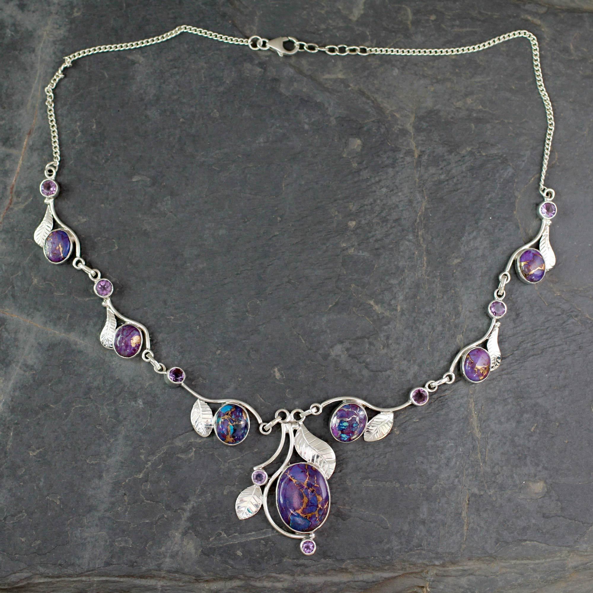 Caressed by sterling leaves, purple composite turquoise gems nestle in silver settings. They mingle with faceted amethyst totaling 3 carats. Crafted by hand, this extraordinary necklace is designed by India's Neeru Goel.