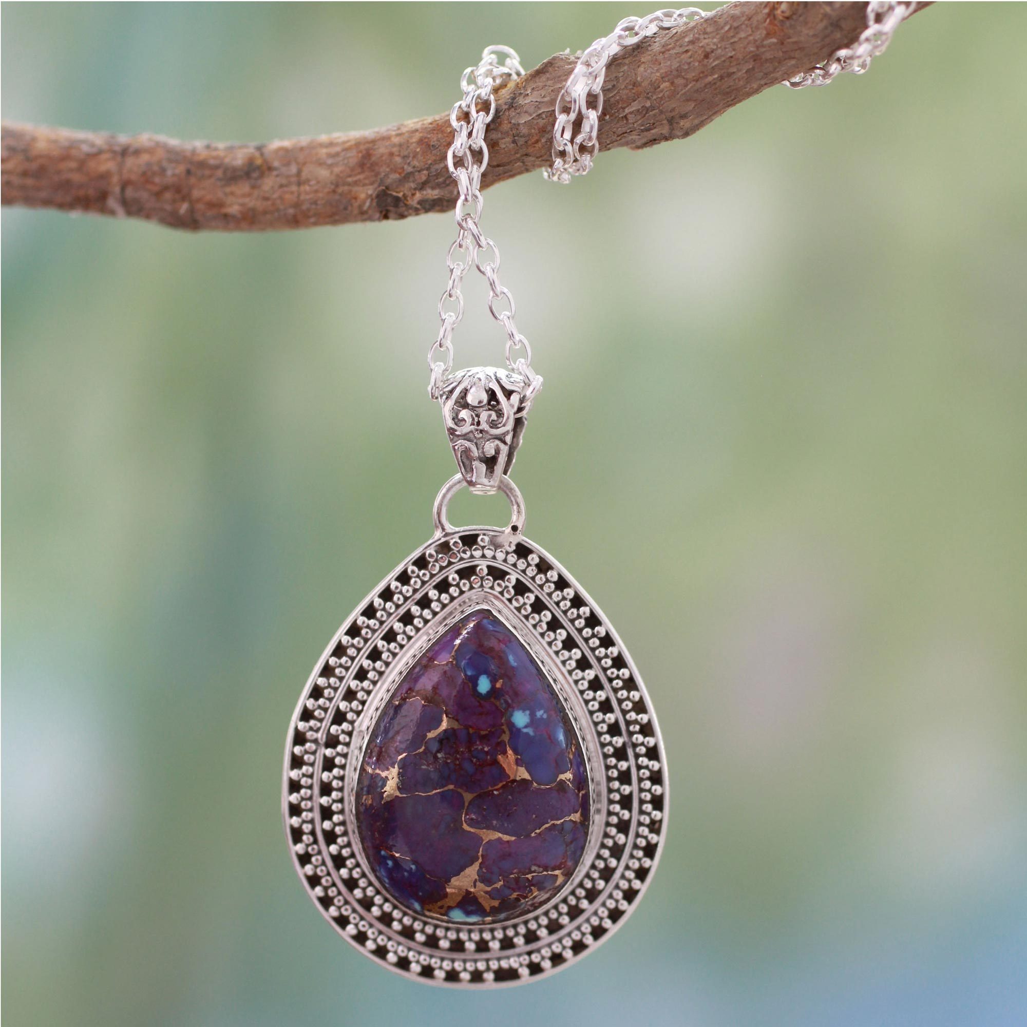 Set with glowing purple turquoise, a teardrop pendant evokes forest secrets. Alok Jain presents an exquisite necklace that surrounds the composite gem in a sterling silver embrace.