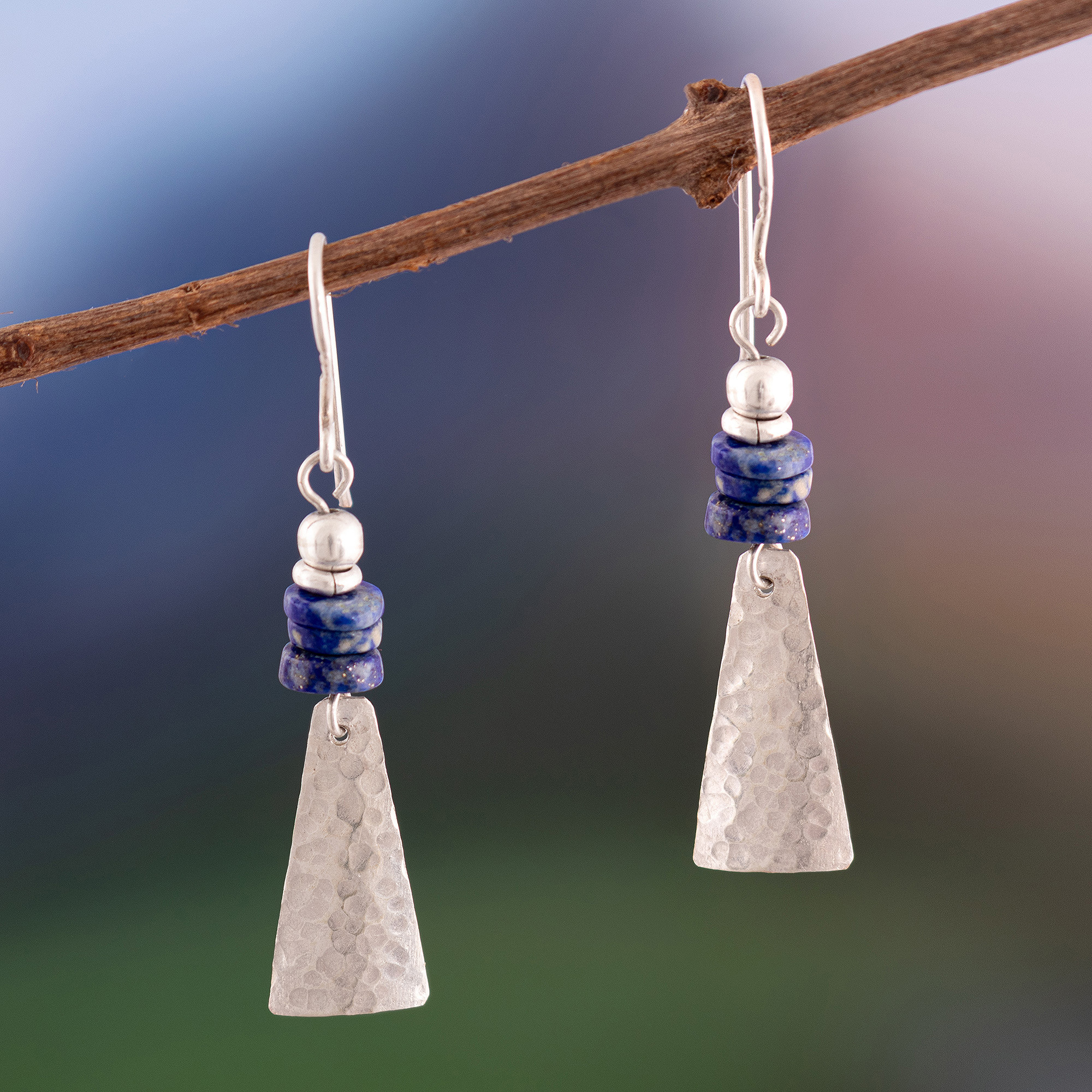 Geometric silhouettes capture the essence of ancient pyramids in these sterling silver dangle earrings, their powerful forms drawn from pre-Hispanic sacred iconography. Designed by Peru's Teodoro Melendez and Family, each earring pairs a hammered and polished finish with vibrant lapis lazuli, gemstones traditionally representing intuition and inner strength. The structured forms pay tribute to ancestral cultures, merging historical reverence with contemporary craftsmanship.