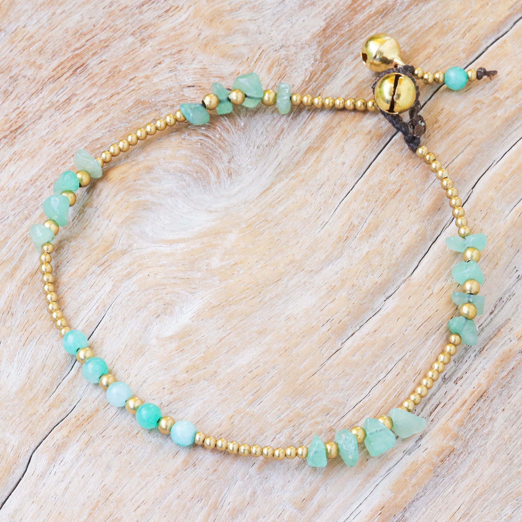 Tiraphan Hasub's lovely anklet is perfect for making music as you walk. The Thai artisan crafts the anklet from petite brass beads and green quartz chips, while two ringing brass bells and a waxed polyester cord form the strand's button closure.